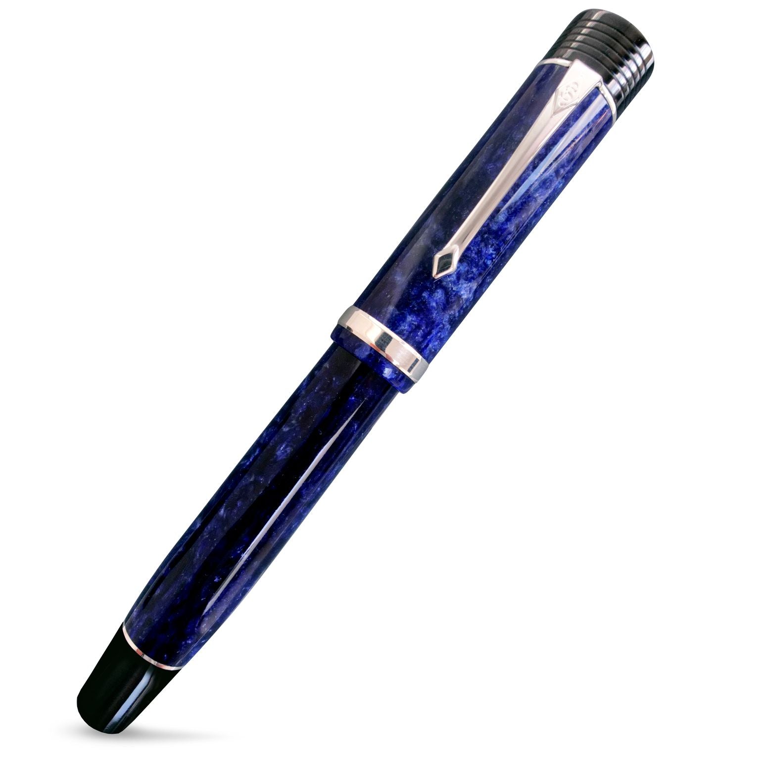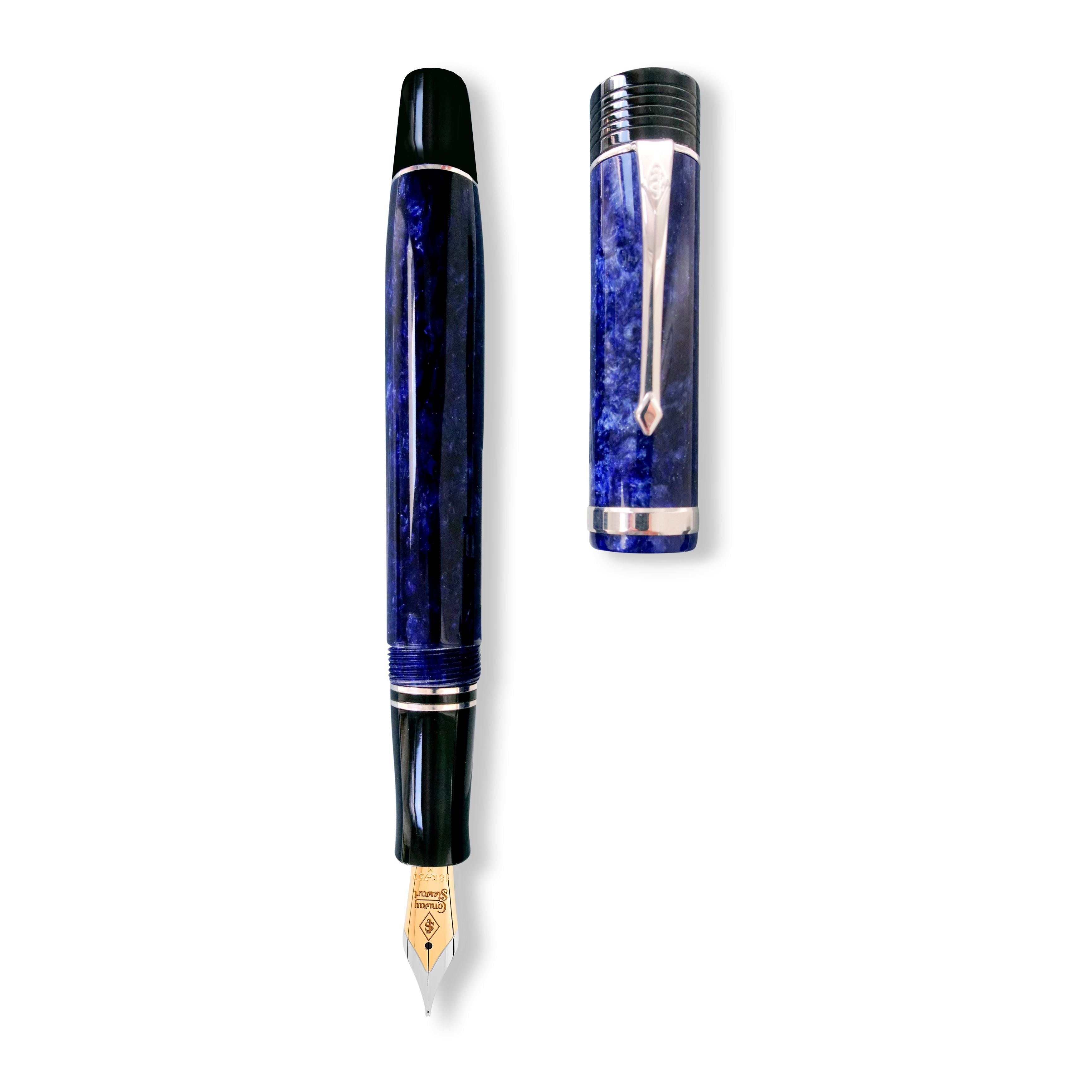 Introducing the Conway Stewart Churchill Blue Stardust, a fountain pen that is back by popular demand. This impressive pen boasts a deep speckled blue background with Sterling Silver fittings that create a striking contrast. Aptly named the Blue Stardust, this pen is sure to catch anyone's eye. The Churchill model has been Conway Stewart's flagship pen for many years and is inspired by the great British statesman who used their pens during wartime. This pen comes in an original black leatherette presentation box and includes a Certificate of Authenticity, User Guide, and anti-tarnish polishing cloth. Choose from a Fountain Pen or Rollerball with a range of nib widths and ink colors. Don't miss out on this stunning piece of craftsmanship.