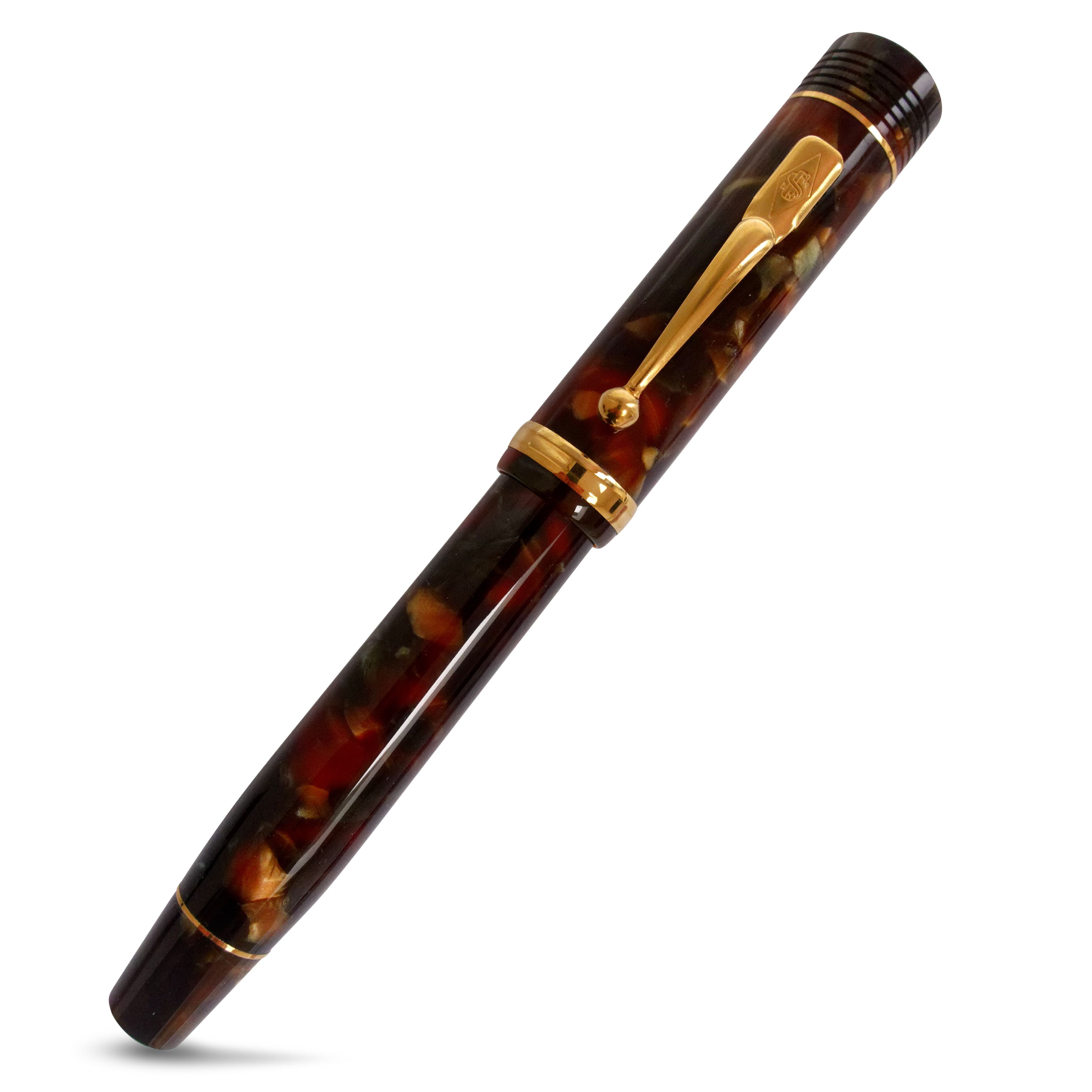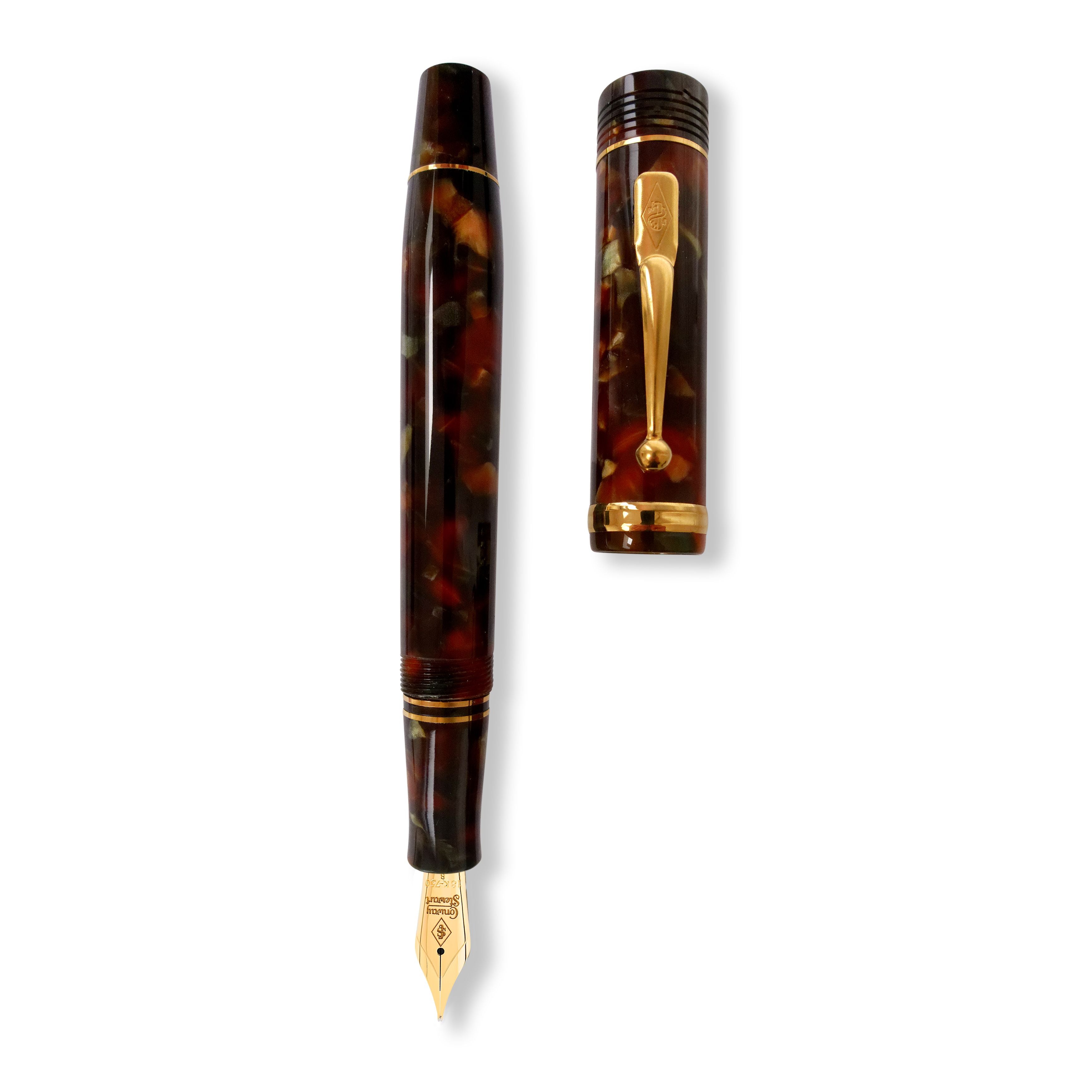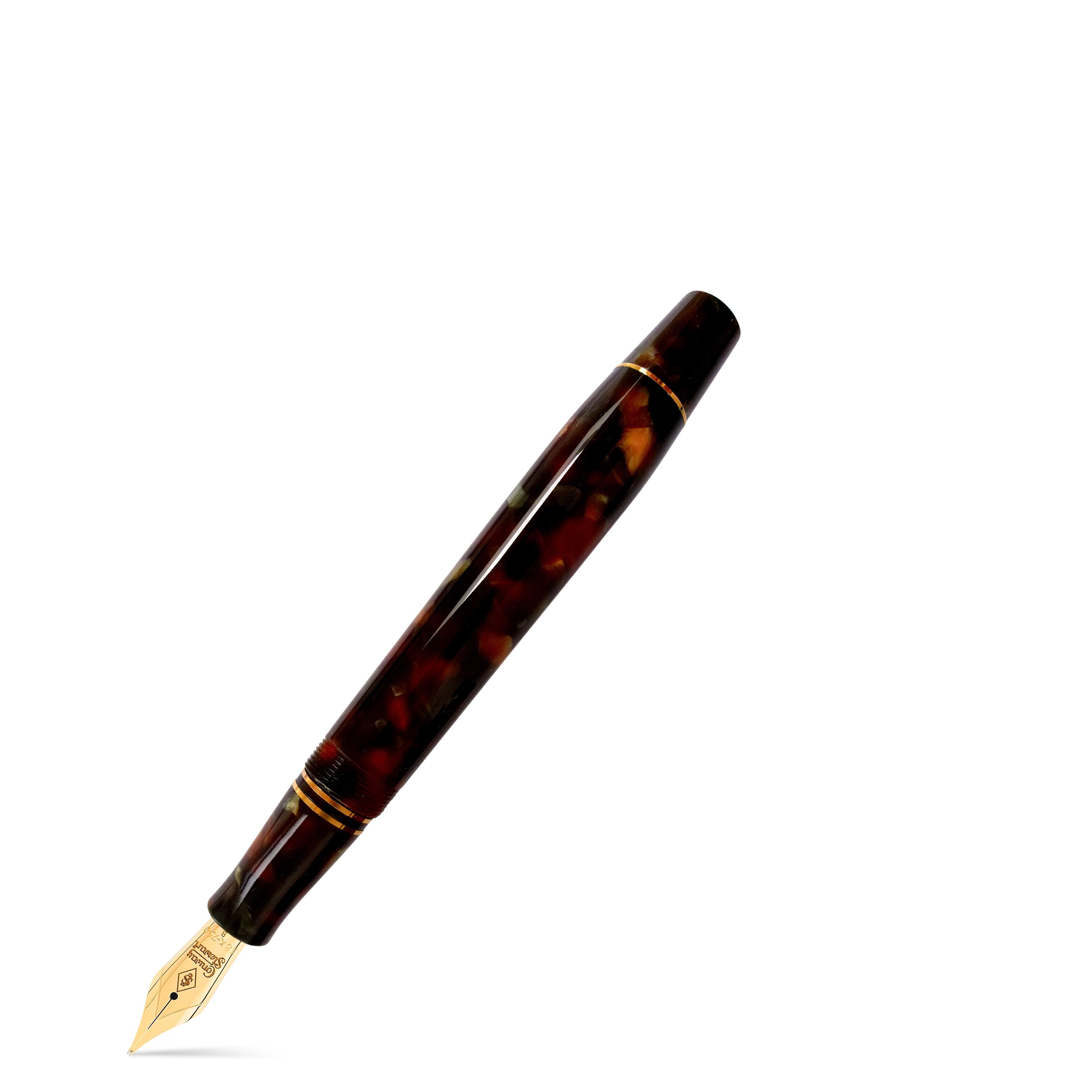 Introducing the Conway Stewart Churchill Bracken – a stunning fountain pen that exudes personality and presence. The smoky bracken hues and pale flecks of claret in the marbled resin create a Victorian study feel, perfect for someone forever inquisitive. With solid 9ct gold fittings, this rare pen is a true standout. Limited to just four pens, each comes with a Certificate of Authenticity, User Guide, and anti-tarnish polishing cloth in an original black leatherette presentation box. Choose from fine, medium or broad 18ct gold Flag nibs to complete this exquisite pen.