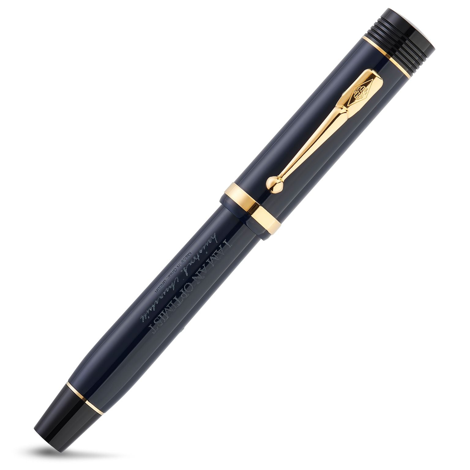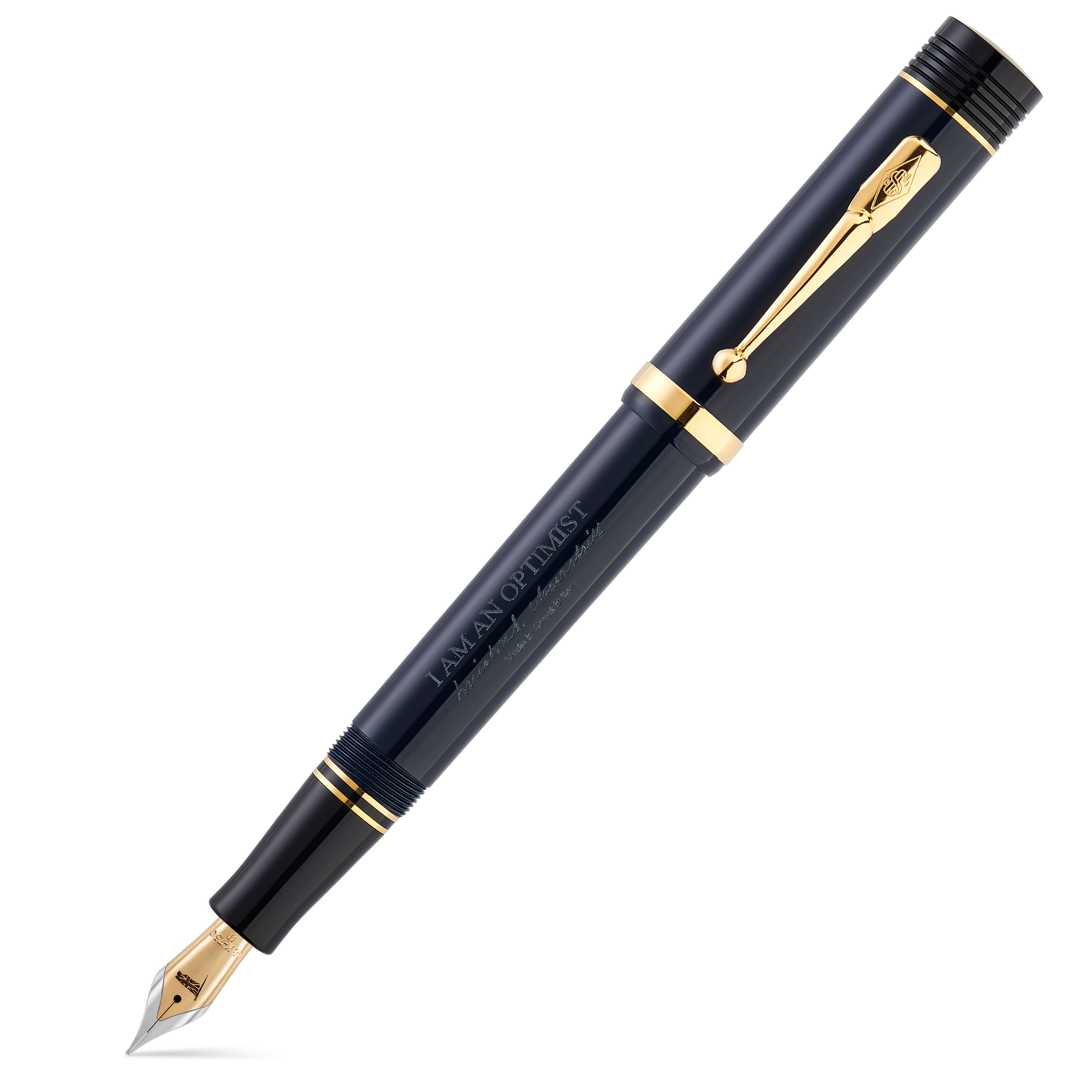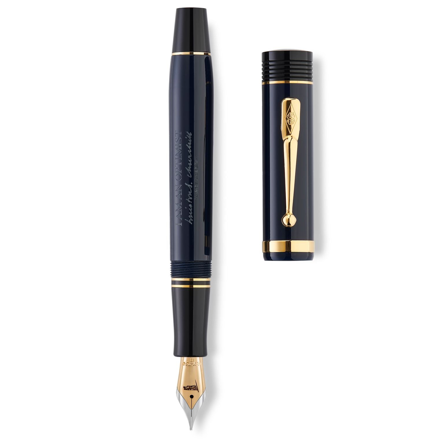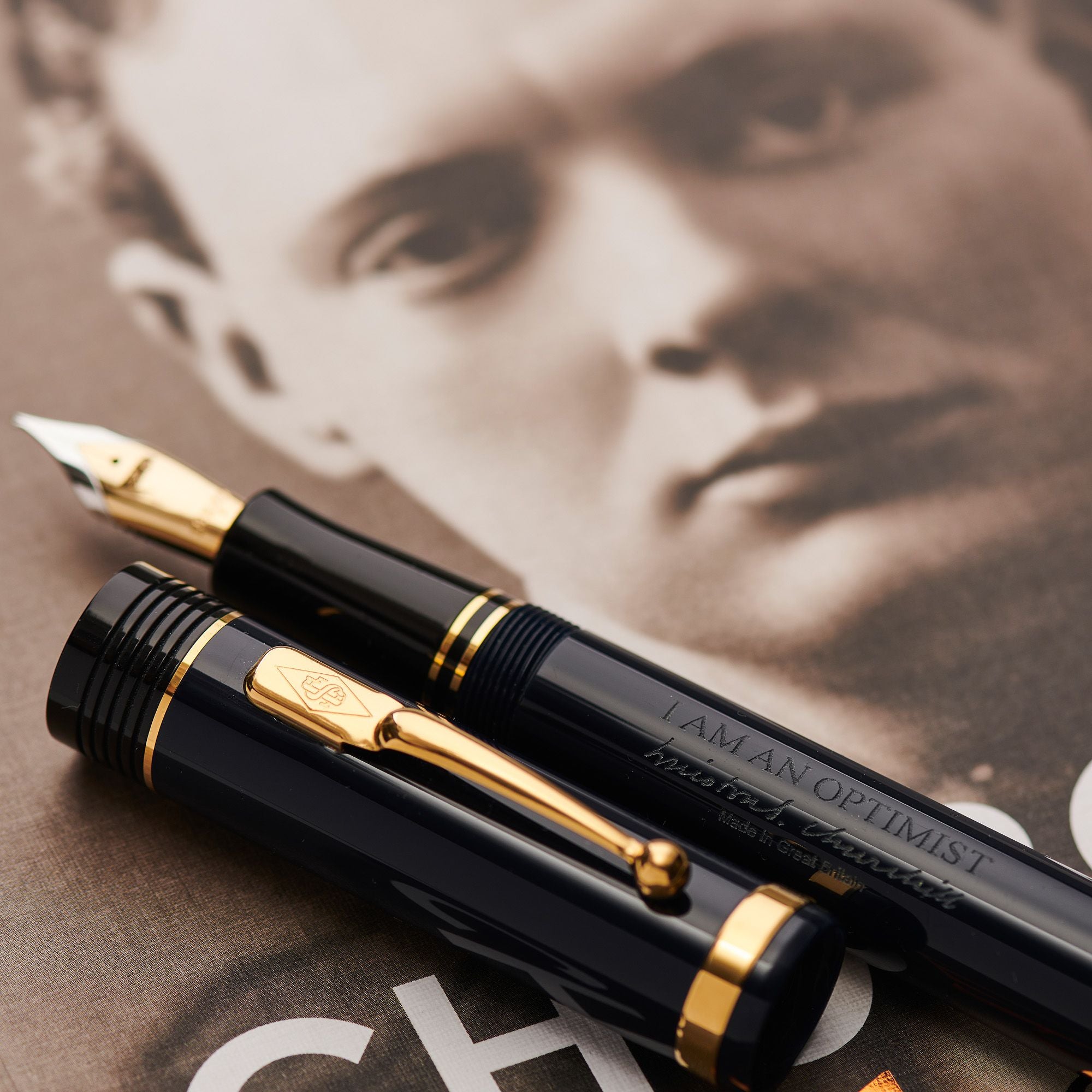 Introducing the fifth pen in the Conway Stewart Churchill Heritage Collection - 'I Am An Optimist.' This series of pens, produced in collaboration with Churchill Heritage, commemorates the legacy of Sir Winston Churchill and his famous quotes. The 'I Am An Optimist' pen is available in Classic Black or Midnight Blue, with Sterling Silver or 9ct Gold trims. The iconic sketch of "Pug," drawn by Churchill, is engraved on the top of the cap, and the barrel displays Churchill's signature, the phrase 'Made in Great Britain,' and the words 'I Am An Optimist.' Each pen comes with a replica of Churchill's Red Cabinet Box, a book titled 'Good Advice from Winston Churchill,' and a facsimile of Churchill's 1909 letter to his wife. The collection is limited to 100 pens worldwide, with up to 20% of each pen sold going to the Churchill Heritage. Choose between a rollerball or fountain pen, with the latter featuring an 18ct gold Flag nib with the Union Jack laser engraved on the front. Keep the memory of Sir Winston Churchill alive with the Churchill Heritage Conway Stewart Collection.