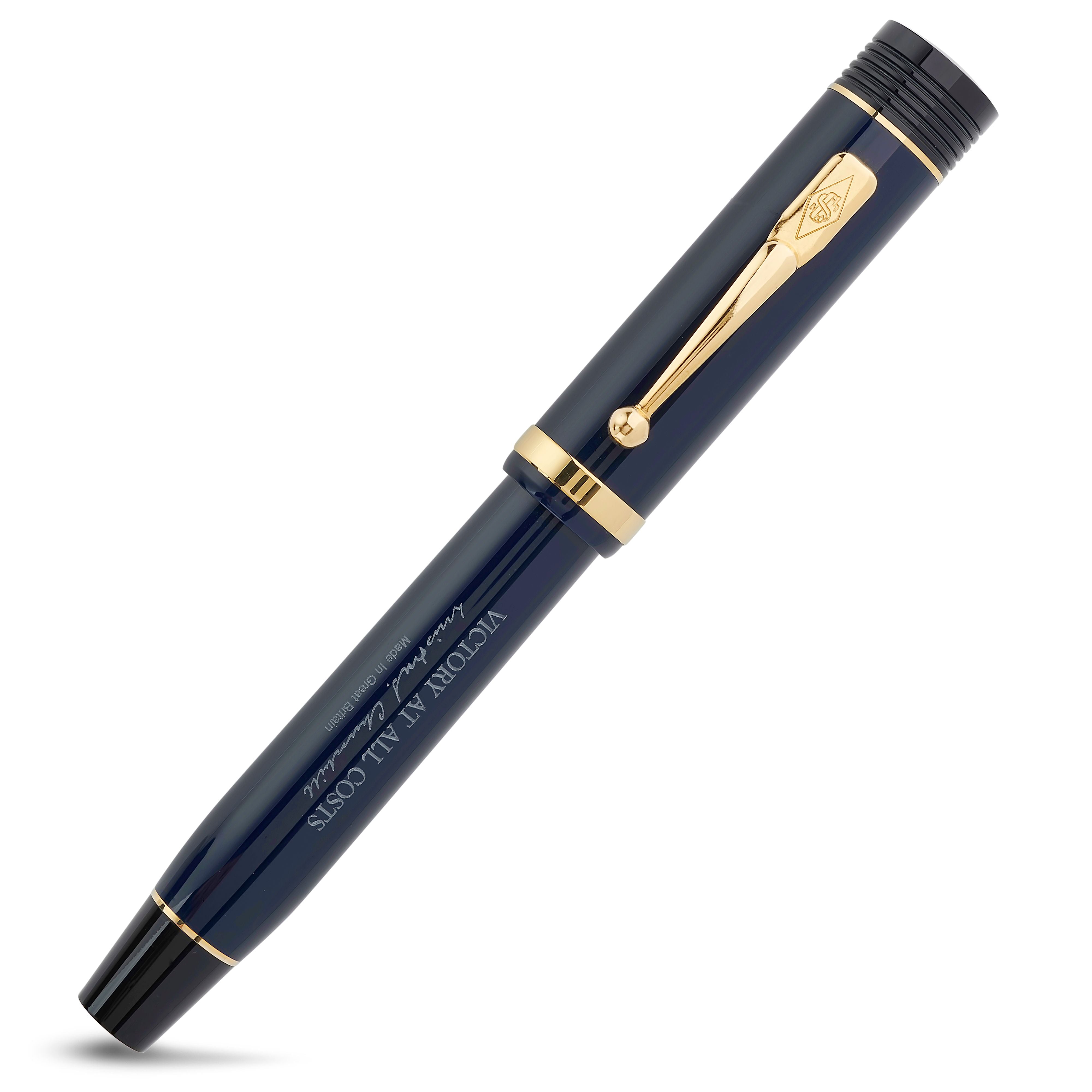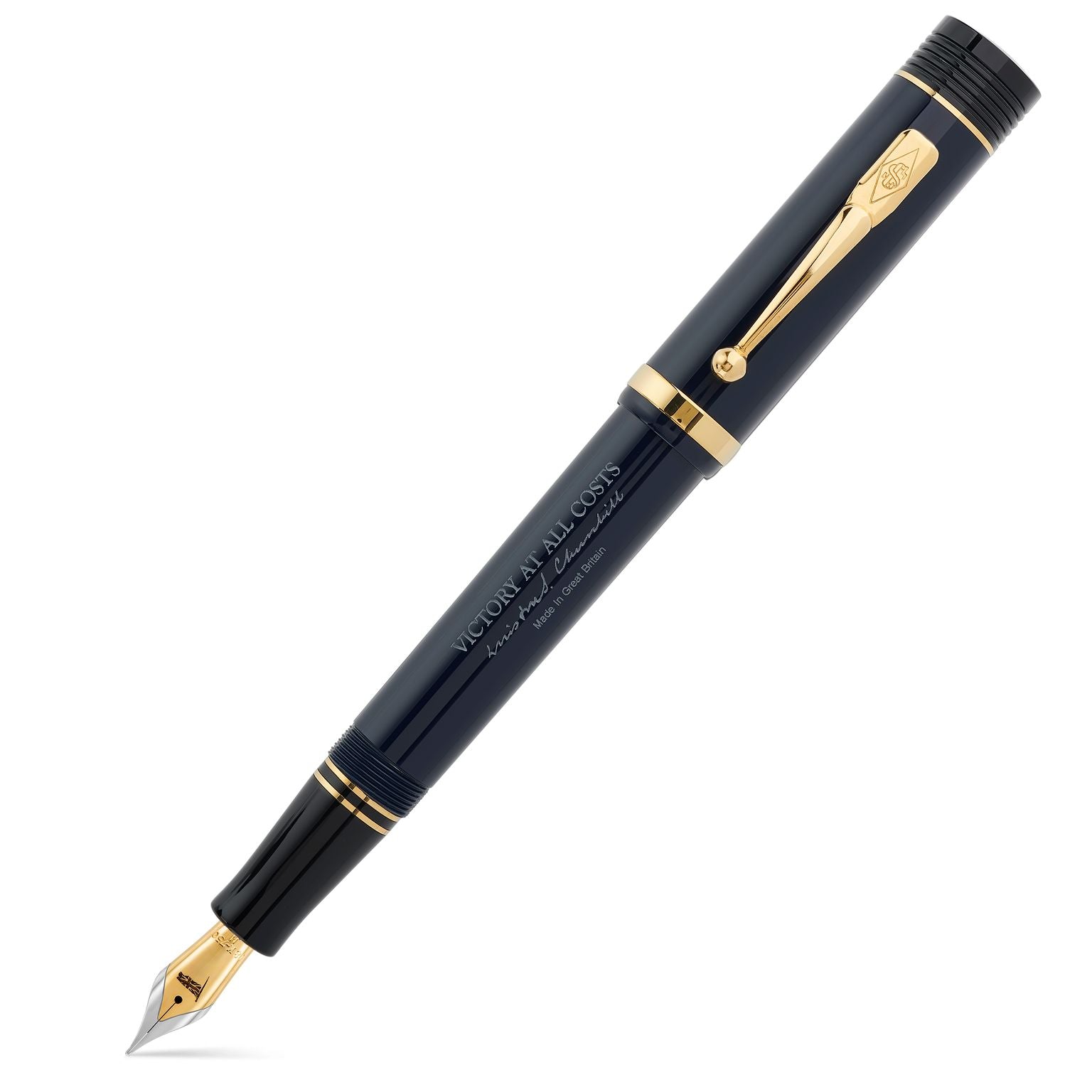 Introducing the Conway Stewart Churchill Heritage 'Victory At All Costs' pen - the latest addition to the limited edition series of pens paying homage to Sir Winston Churchill's most famous quotes. Available in classic black or midnight blue, each pen comes with a replica of Churchill's iconic red cabinet box, a copy of the book "All Will Be Well - Good Advice from Winston Churchill," and a facsimile of one of his handwritten letters. With only 100 pens made for each quote, this pen is a one-of-a-kind collector's item. Engraved with Churchill's signature and the iconic sketch of "Pug," the pen is a tribute to the Great Man and his legacy. Additionally, up to 20% of your purchase goes towards supporting the Churchill Heritage, which keeps Churchill's memory alive for future generations. Choose between a rollerball or fountain pen, both of which are equipped with an 18ct gold Flag nib with the Union Jack laser engraved on the front. Don't miss out on owning a piece of history while supporting a great cause.