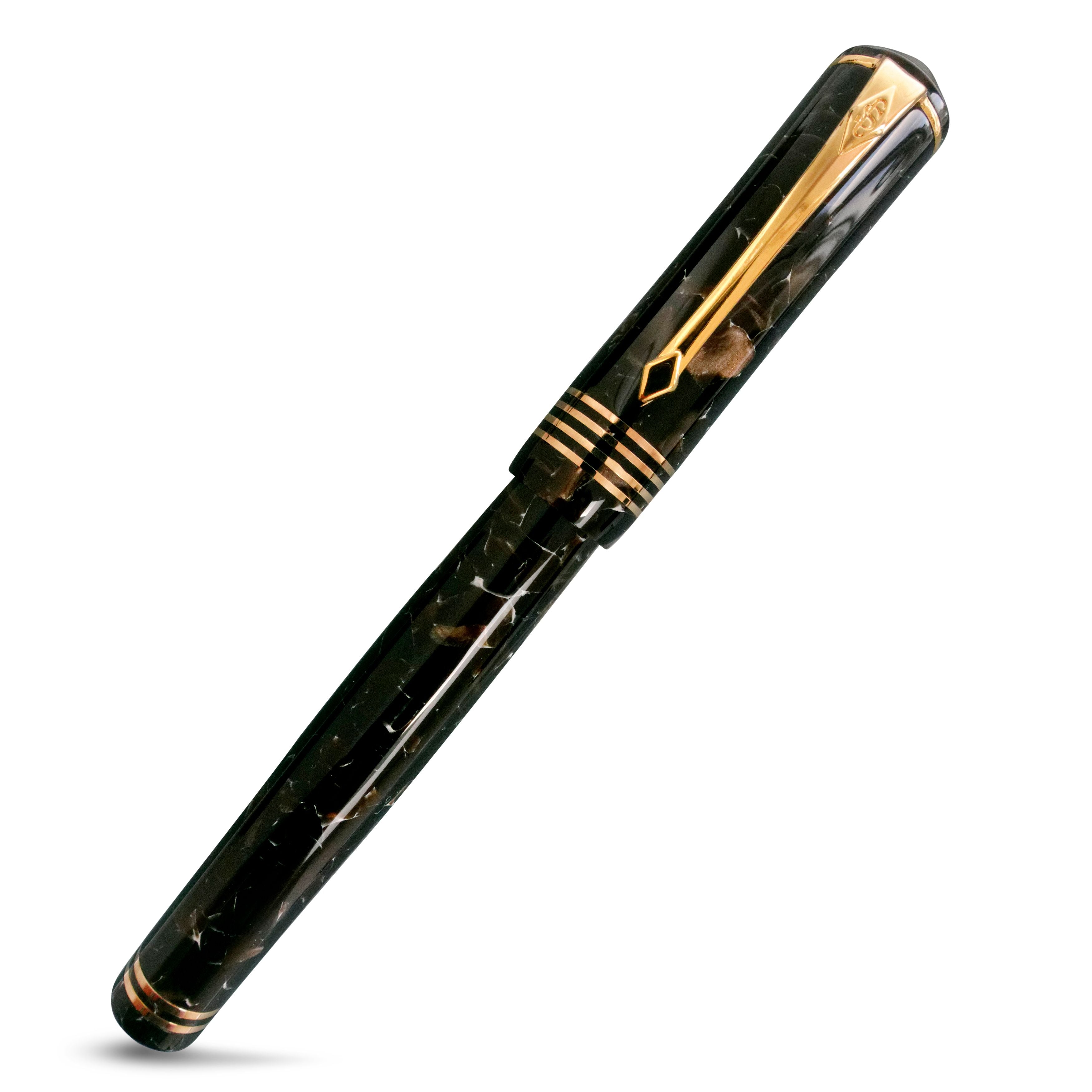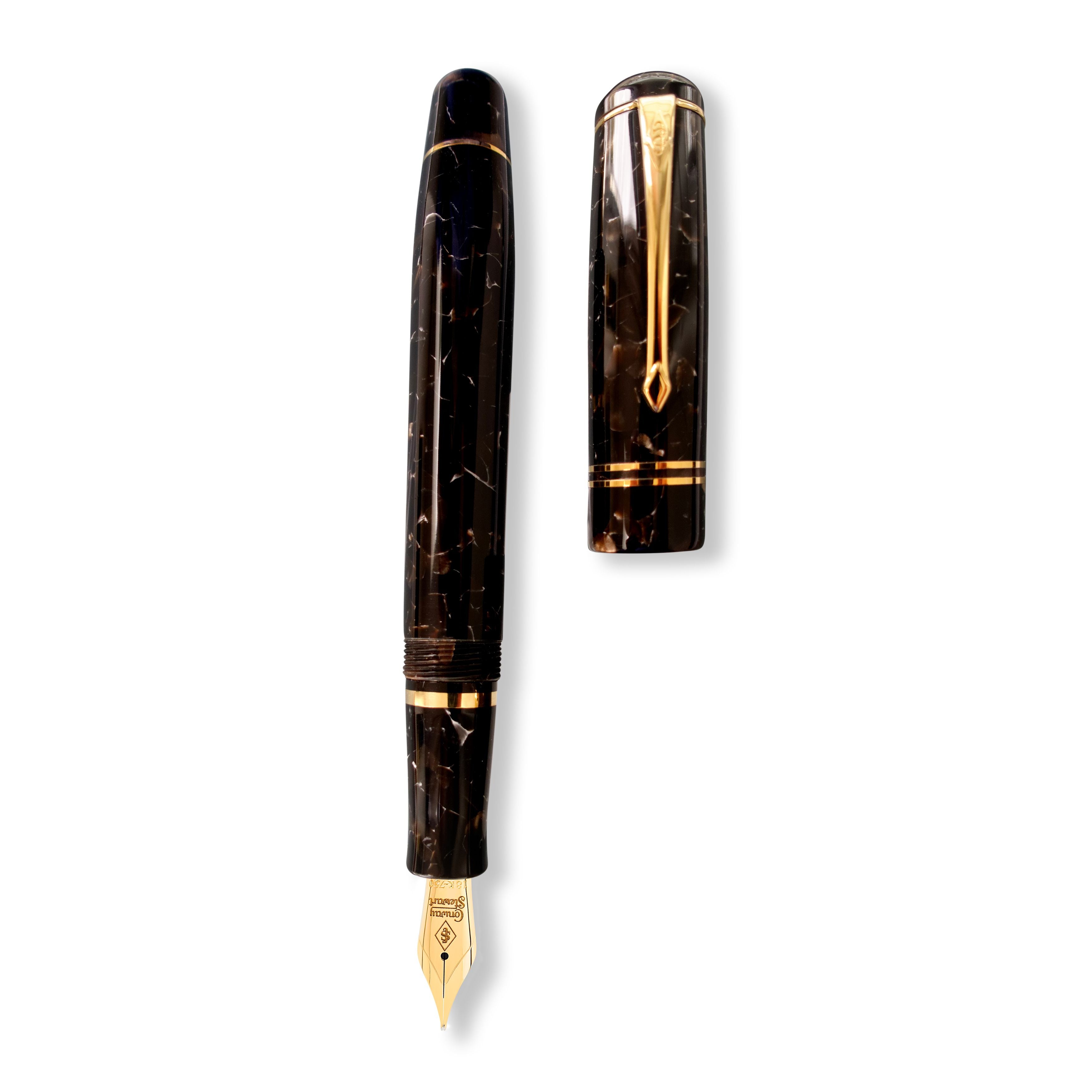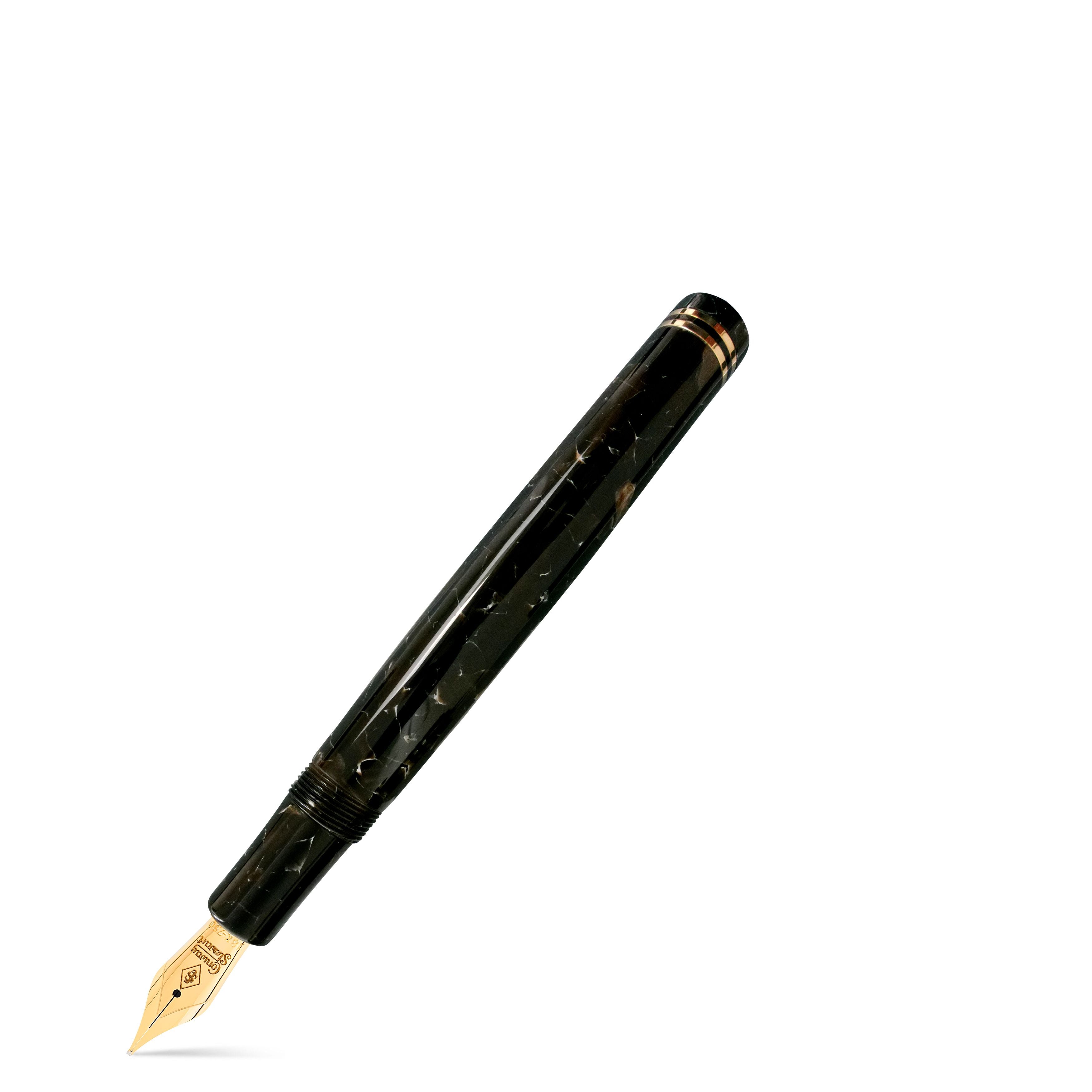 The Conway Stewart Raleigh Dartmoor is a stunning fountain pen with a sense of adventure. Named after the Elizabethan explorer Sir Walter Raleigh, it is the perfect addition to any collection with its marbled brown color, inspired by the wild moorlands of Devon's Dartmoor National Park. This unique pen departs from tradition with its distinct design elements, including solid gold rings and an inward-curved cap. With only seven available, each pen features a 2-tone 18ct gold Flag nib and comes in a Conway Stewart black leather presentation box that doubles as a pen stand. A rakish touch of distinction for any writer or adventurer.
