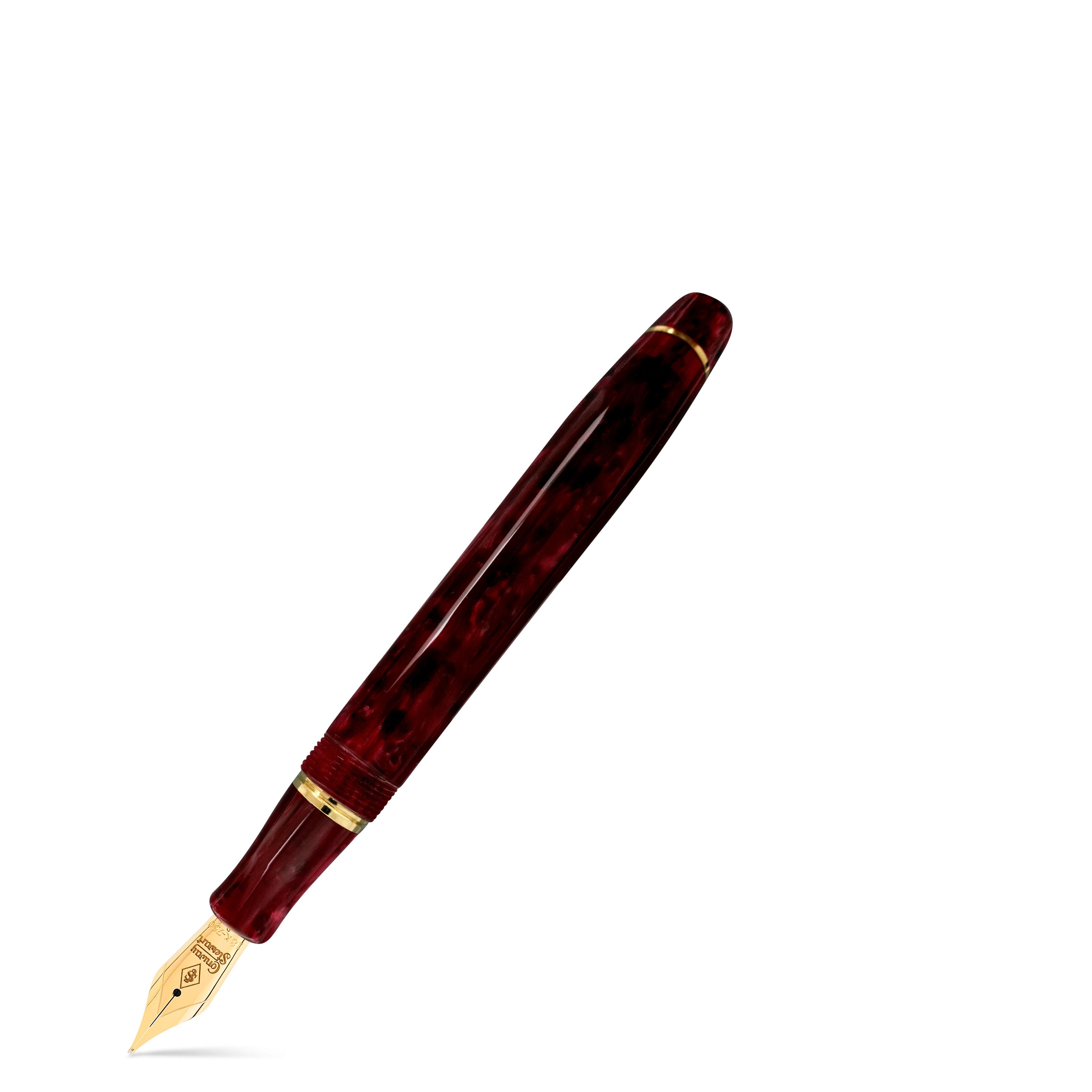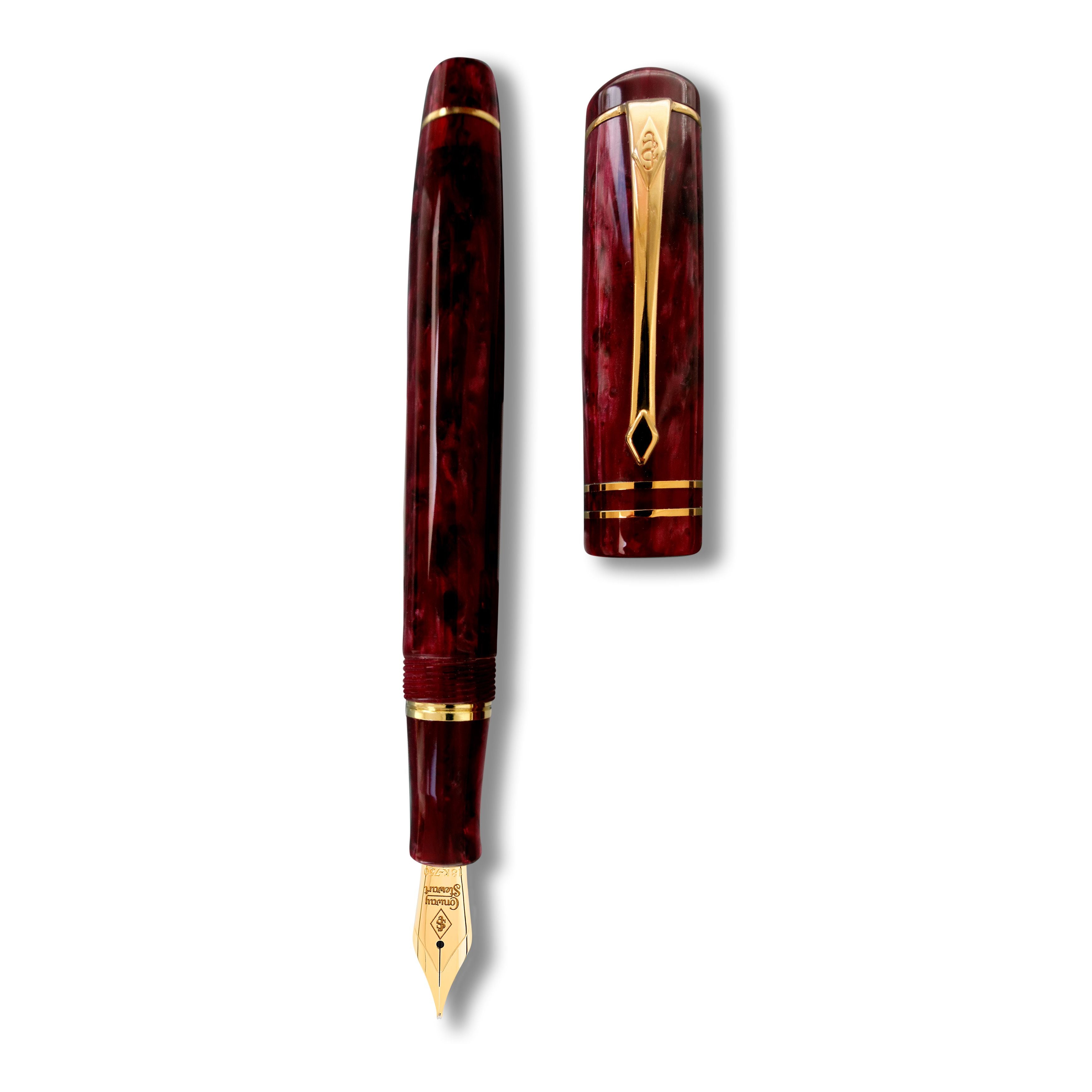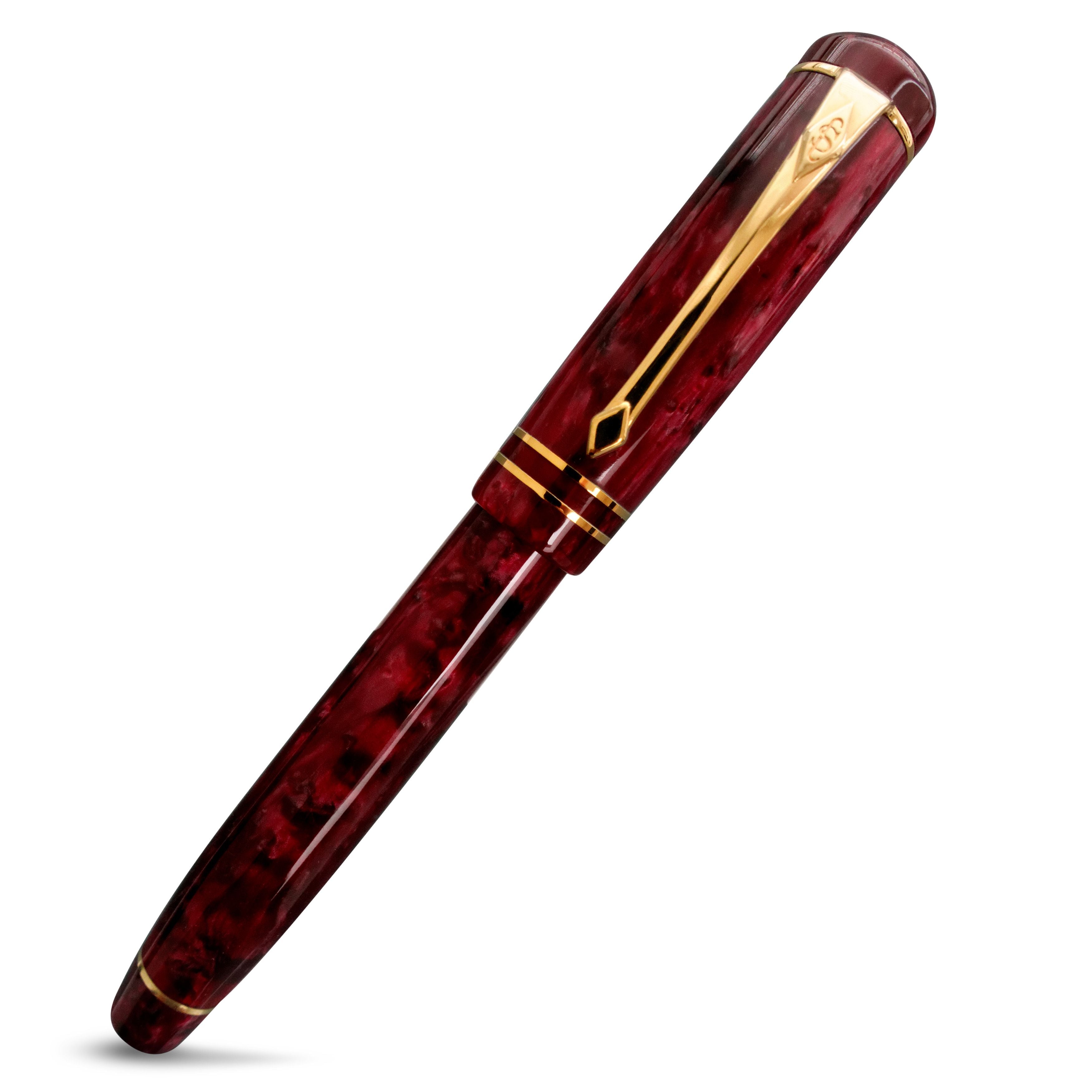Introducing the Conway Stewart Wordsworth Burgundy Blush fountain pen - a classically styled pen with elegant rounded features reminiscent of the popular Winston. The mid-sized pen has a tapering barrel and solid gold bands on the cap and barrel, exuding warmth and luxury. Made from complex acrylic material in shades of claret, no two pens are the same, making it as unique as its owner. Originally issued in a limited edition of 50, only 12 pens remain. Available as a fountain pen with a choice of Fine, Medium or Broad 2-tone 18ct gold Flag nibs and presented in a black leather box that doubles as a desk stand.