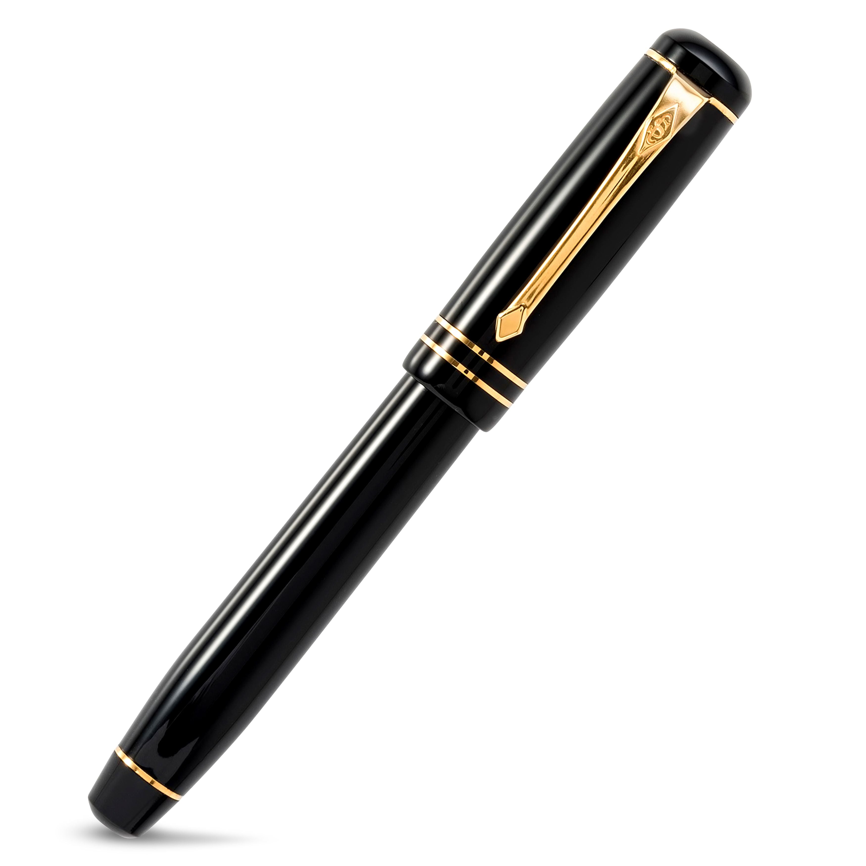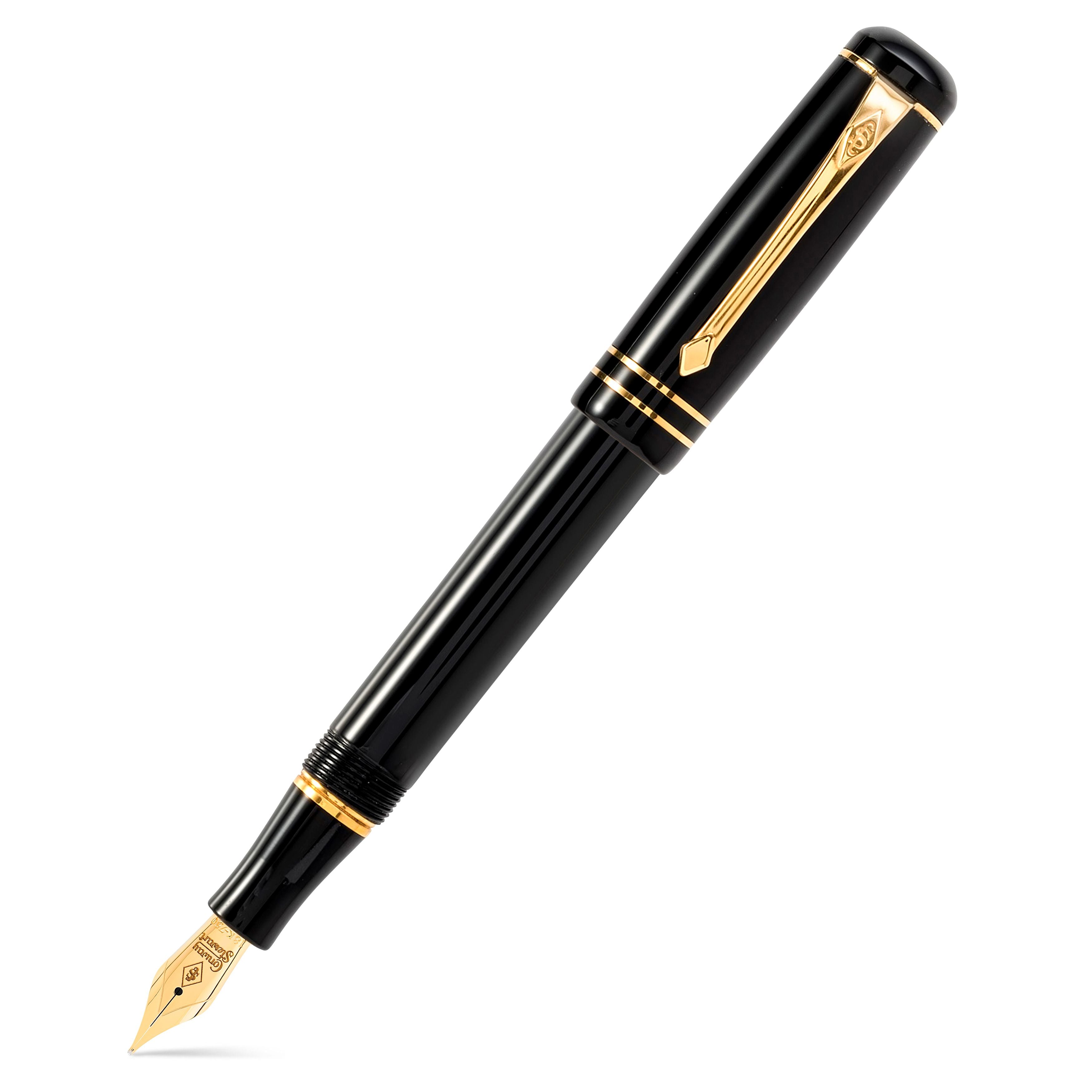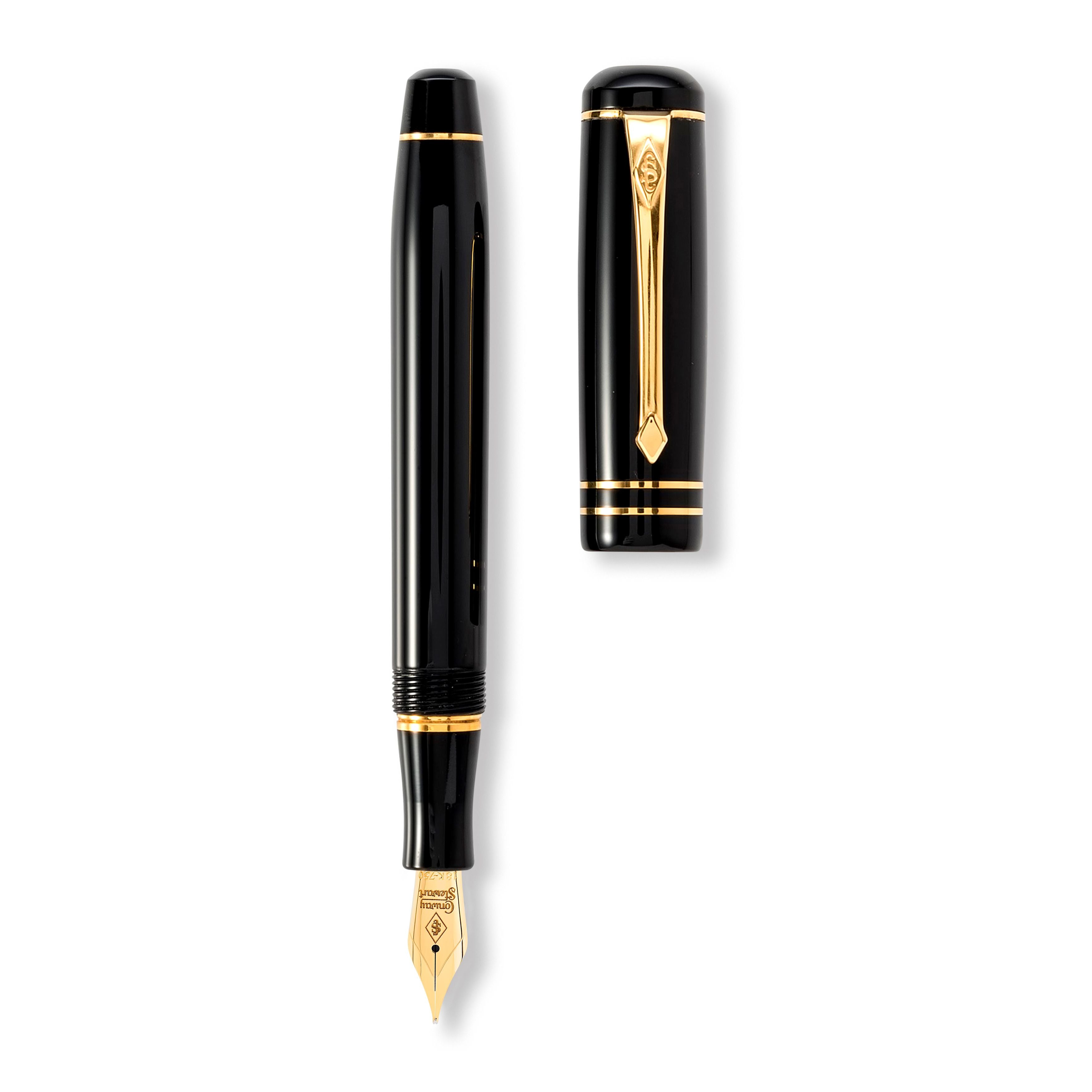 Looking for a timelessly elegant fountain pen? Look no further than the Conway Stewart Wordsworth Classic Black! This mid-sized pen features a tapering barrel and rounded top, reminiscent of the larger Winston model. The solid gold bands on the cap and barrel add a touch of luxury, and the traditionally styled clip ensures it's always close at hand. With only 7 of these pens available, each named after the 19th Century poet William Wordsworth, it's a unique and distinctive addition to any collection. Available with a choice of Fine, Medium, or Broad 18ct gold Flag nibs and housed in a black leather presentation box that doubles as a desk stand.