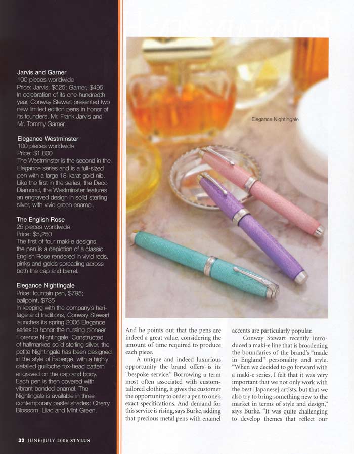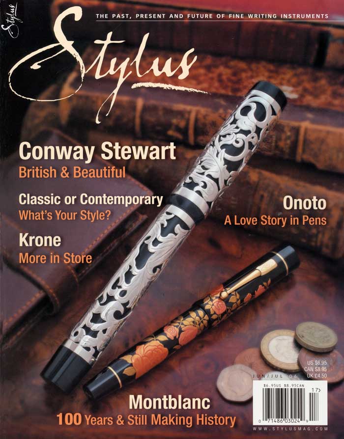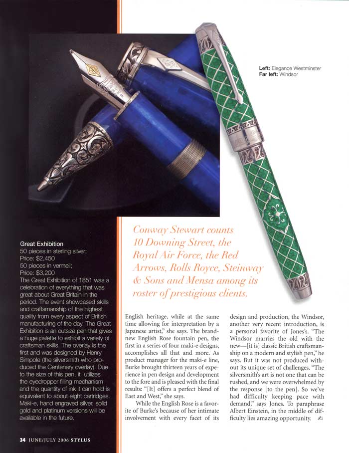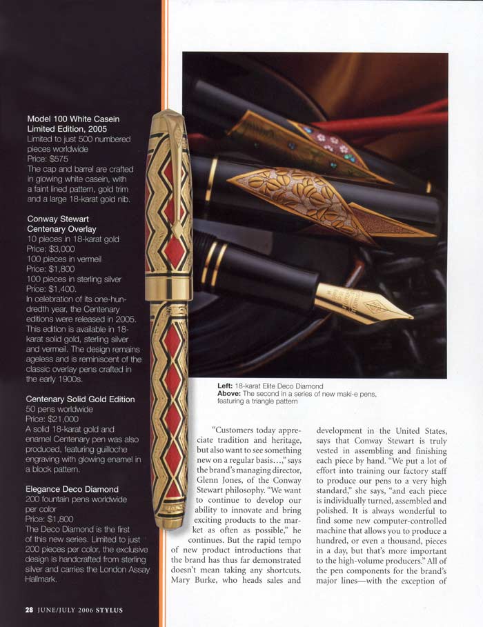 Conway Stewart recently intro- duced a maki-e line that is broadening the boundaries of the brand's "made in England" personality and style. "When we decided to go forward with a maki-e series, I felt that it was very important that we not only work with the best [Japanese] artists, but that we also try to bring something new to the market in terms of style and design," says Burke.