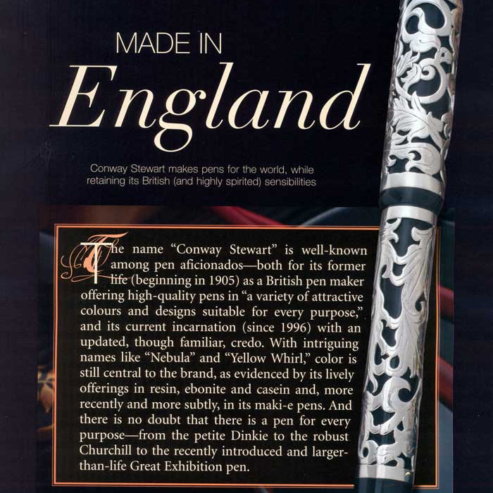 The name "Conway Stewart" is well-known among pen aficionados-both for its former life (beginning in 1905) as a British pen maker offering high-quality pens in "a variety of attractive colours and designs suitable for every purpose," and its current incarnation (since 1996) with an updated, though familiar, credo. With intriguing names like "Nebula" and "Yellow Whirl," color is still central to the brand, as evidenced by its lively offerings in resin, ebonite and casein and, more recently and more subtly, in its maki-e pens. And there is no doubt that there is a pen for every purpose from the petite Dinkie to the robust Churchill to the recently introduced and larger- than-life Great Exhibition pen.