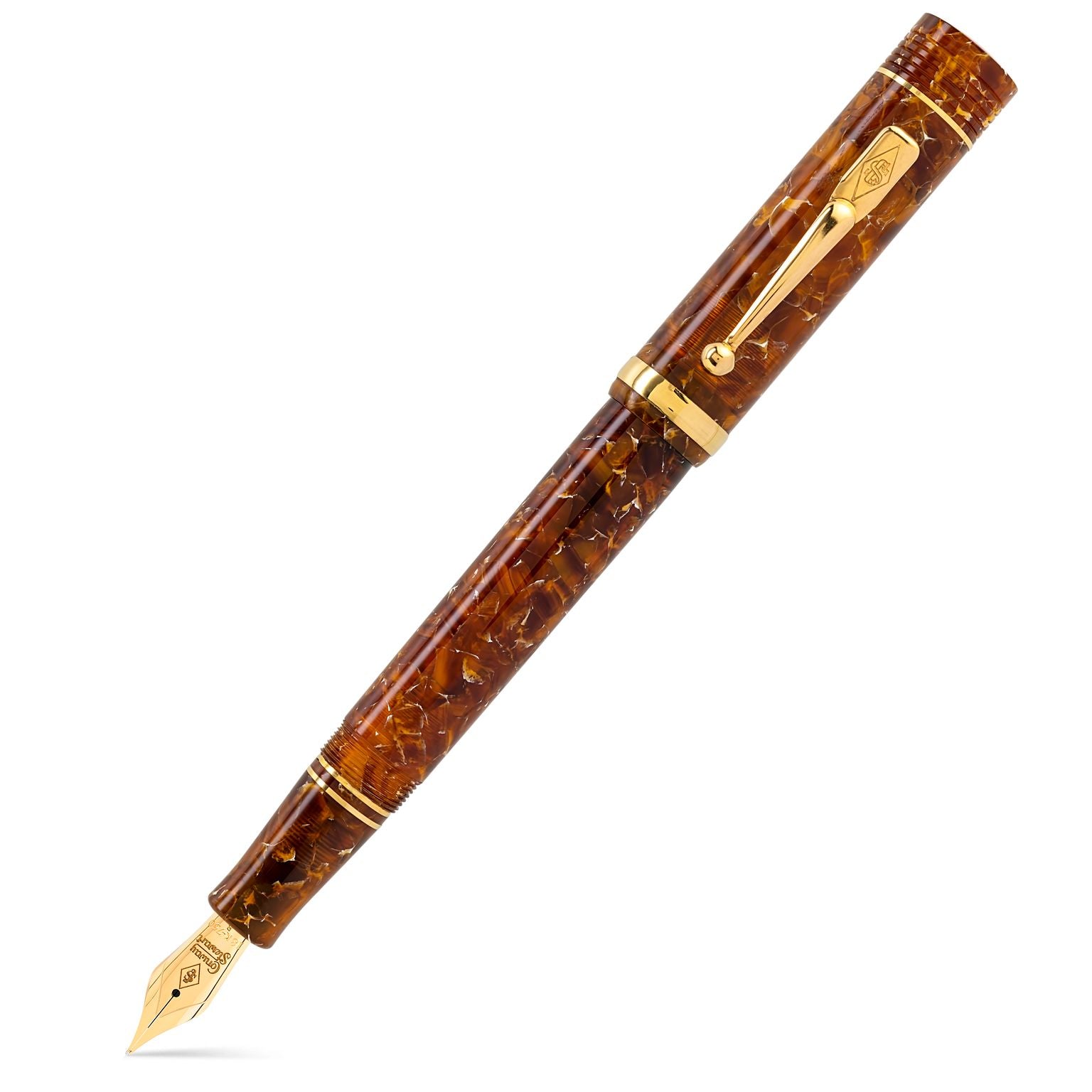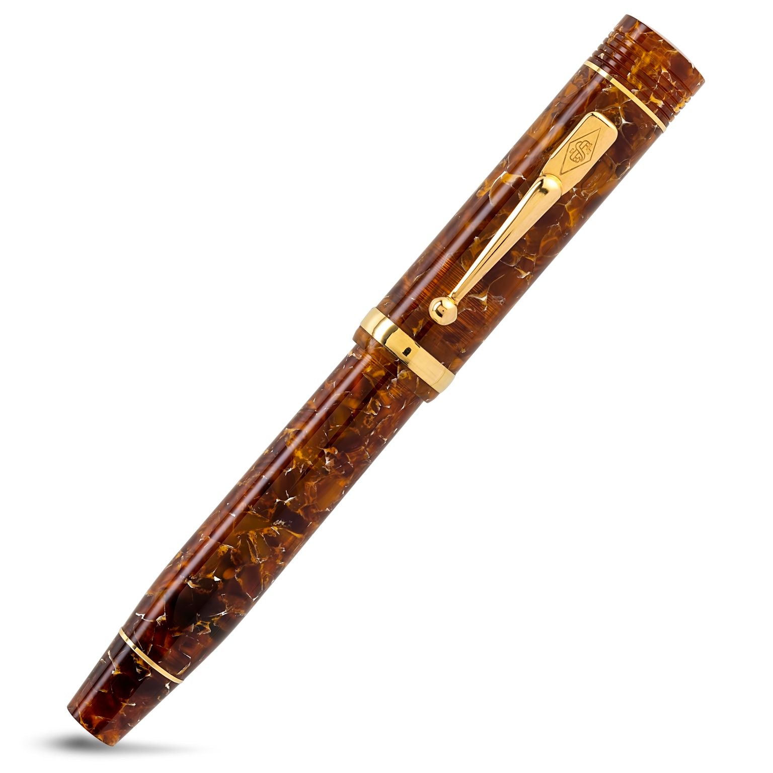 The Conway Stewart Churchill Amber Fountain Pen is a limited edition masterpiece inspired by the renowned British Statesman. The rich amber colours of the pen are complemented by the gold fittings and broad, solid gold hallmarked cap band. Each pen comes with a Certificate of Authenticity, Conway Stewart User Guide, and anti-tarnish polishing cloth. Housed in an original black leatherette presentation box, this fountain pen exudes stature and natural beauty. Don't miss your chance to own one of only 20 limited edition Churchill Amber fountain pens.