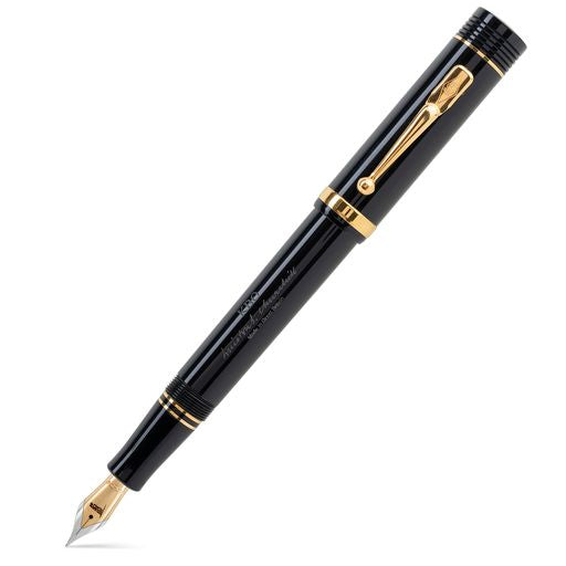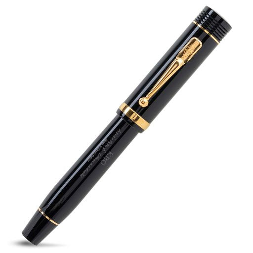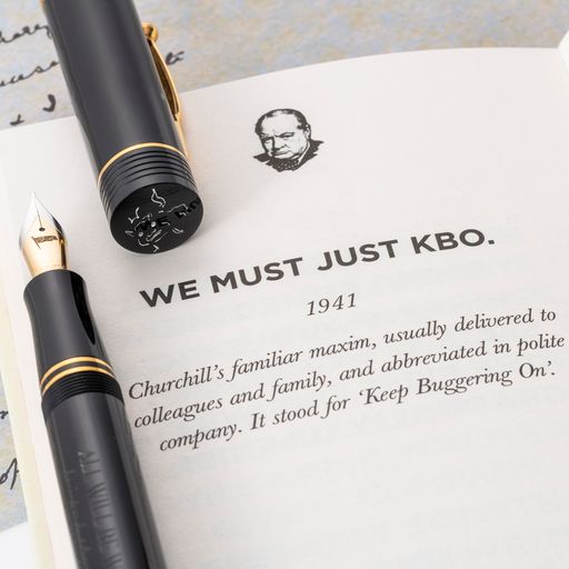 The Conway Stewart Churchill Heritage 'KBO' pen is the fourth in the series of limited edition pens produced in association with Churchill Heritage. Inspired by Churchill's famous maxim "Keep Buggering On," the KBO pen comes in Classic Black or Bordeaux, with either 9ct gold or Sterling Silver trims. Each pen is engraved with Churchill's iconic "Pug" sketch and signature, and the words "KBO" and "Made in Great Britain." The pen comes in a replica of Churchill's Red Cabinet Box, along with a book of 120 of his famous quotes and a facsimile of his 1909 letter to his wife. Limited to 100 pens worldwide, up to 20% of every pen sold goes to Churchill Heritage to support events and education that preserve Churchill's legacy. The KBO pen is available as a Rollerball or Fountain Pen with an 18ct gold Flag nib featuring the Union Jack laser engraved on the front.