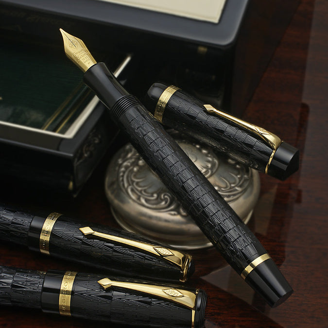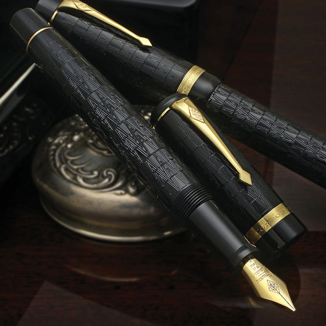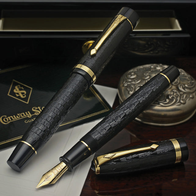 Der Churchill ist Conway Stewarts langjähriges Flaggschiffmodell. Majestätisch und zeitlos in Haptik und Aussehen ist der Churchill ein Dauerbrenner für diejenigen geblieben, die ein stattliches, übergroßes Schreibgerät bevorzugen. Die Kappe und der Korpus aus glänzend schwarzem Kunstharz sind mit einem kontrastierenden 18-Karat-Massivgoldbesatz hervorgehoben. Die aufwendige Gravur, die sowohl die Kappe als auch den Korpus ziert, hebt die Connoisseur Churchill zusätzlich hervor. Der Connoisseur Churchill ist nicht nur das herausragende Modell der Connoisseur Collection, er ist auch perfekt ausbalanciert, um das Schreiben zu erleichtern.