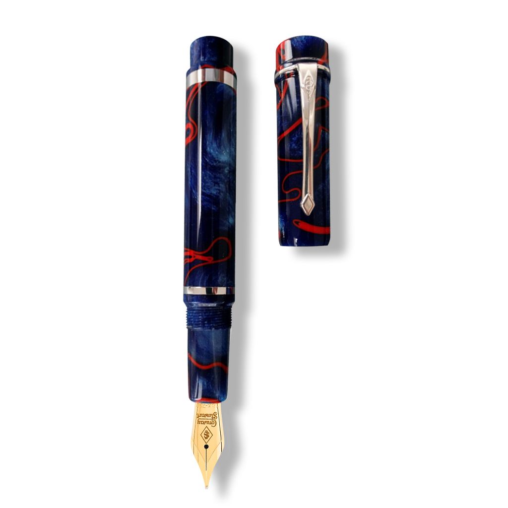 Der Füllfederhalter Conway Stewart Bard Scarlet Whirl zollt William Shakespeare, einem der größten Schriftsteller aller Zeiten, anlässlich seines 400. Todestages Tribut. Die Bard-Kollektion ist eine der beeindruckendsten Linien von Conway Stewart, mit einem eckigen Profil und einer unverjüngten Kappe und einem Schaft, die ihr ein Aussehen von robuster Eleganz verleihen. Der hoch angebrachte Clip und das reduzierte Schaftende machen diesen Stift praktisch und für eine Vielzahl von Handgrößen geeignet. Mit einer Auswahl an feinen, mittleren oder breiten 2-Ton-Flaggenfedern aus 18 Karat Gold ist der Bard Scarlet Whirl eine atemberaubende Ergänzung für jede Sammlung.