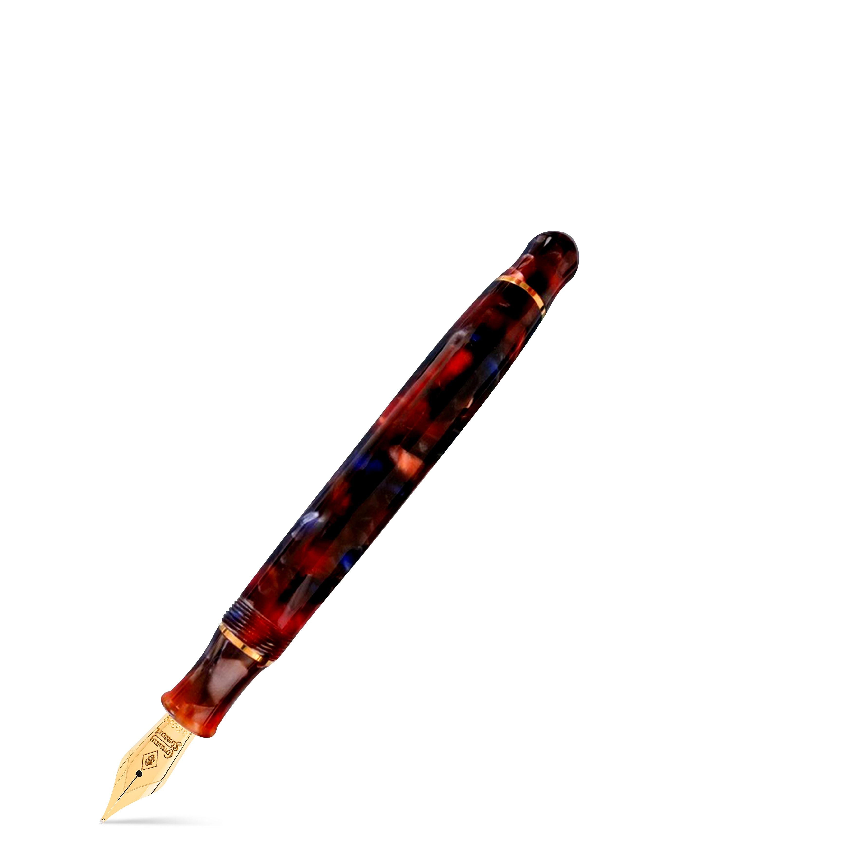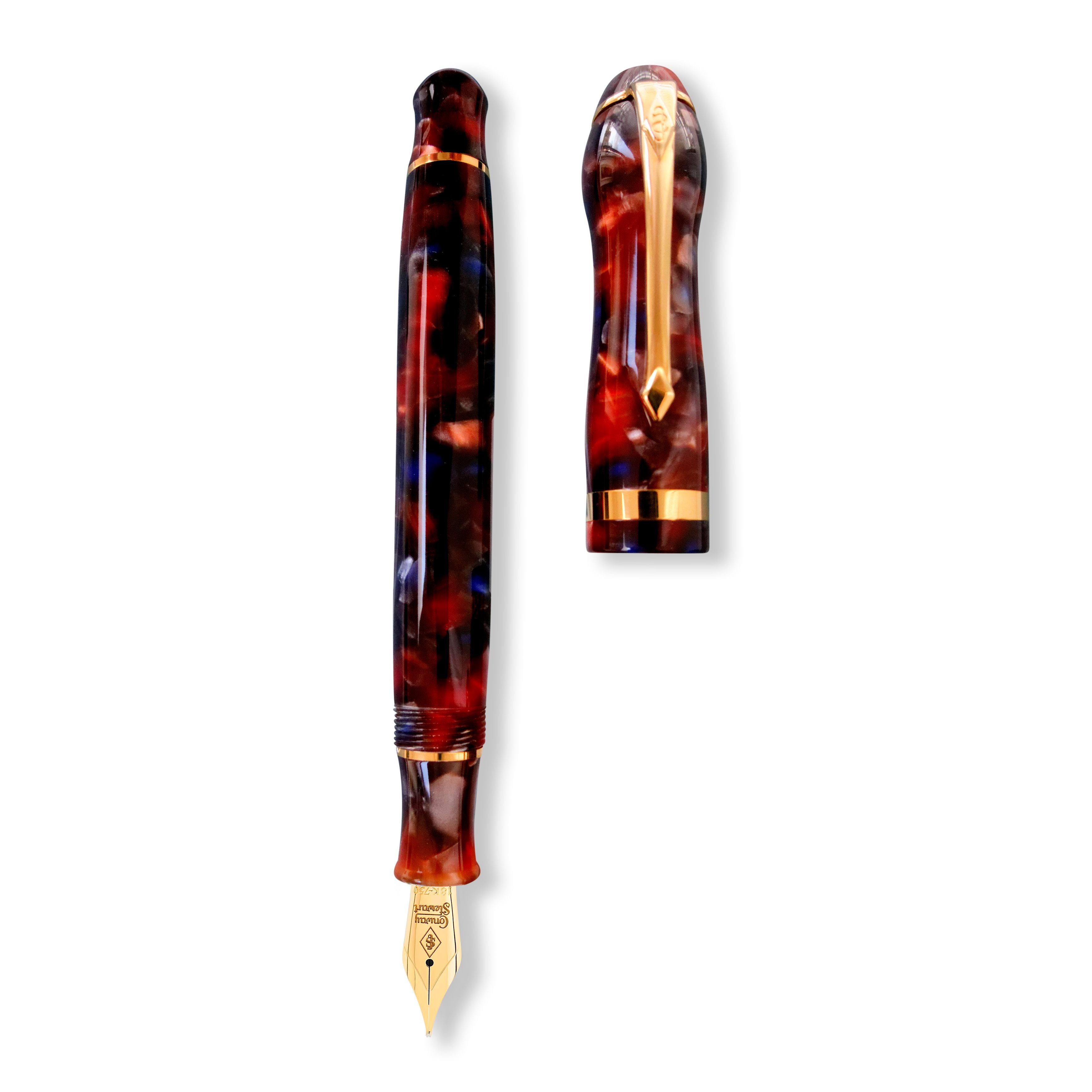 Con solo cuatro disponibles, el Conway Stewart Regency Sepia Blue emana una elegancia atemporal con sus atractivas características curvas y detalles en oro macizo. Lanzado originalmente en 2009, este bolígrafo de tamaño mediano es muy buscado por los coleccionistas serios, y su diseño único está inspirado en el extravagante período de la Regencia en la historia británica. Nombrado en honor al período en el que Price Regent defendió las bellas artes y encargó hitos arquitectónicos, el Regency Sepia Blue está adornado con una ancha banda dorada en el capuchón y dos bandas doradas en el depósito. Alojado en una caja de presentación de cuero negro, este bolígrafo no es solo un instrumento de escritura, sino también una obra maestra decorativa para su escritorio.