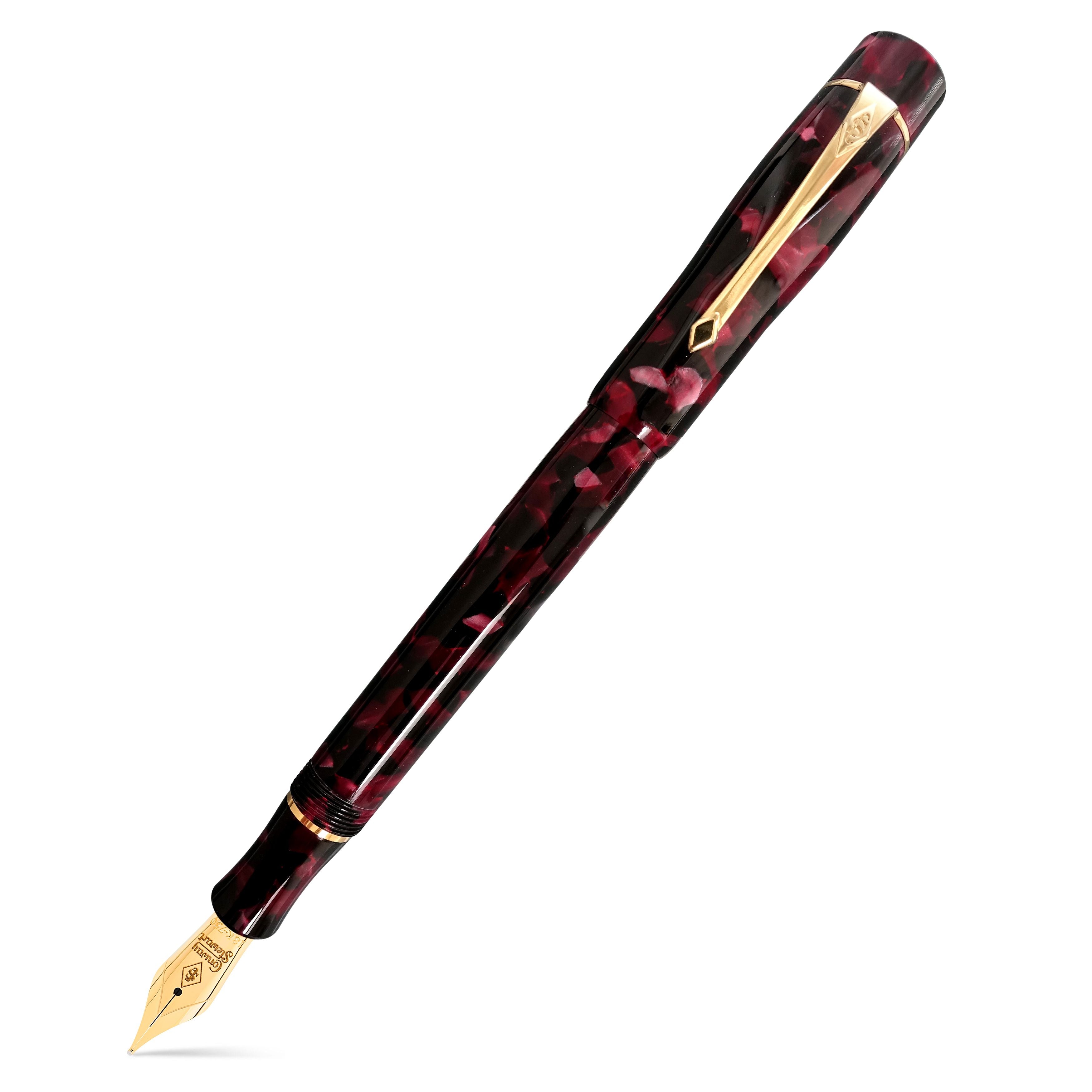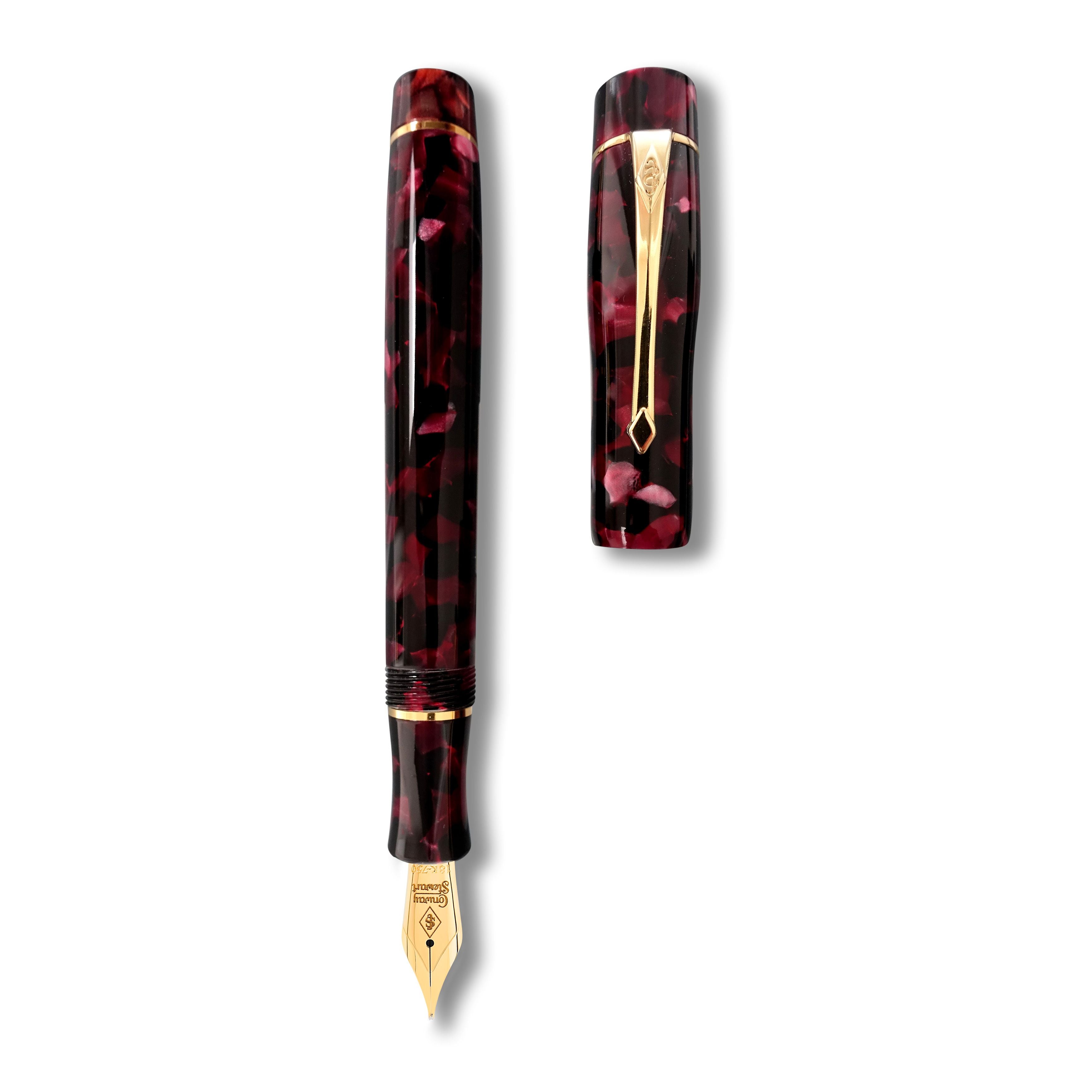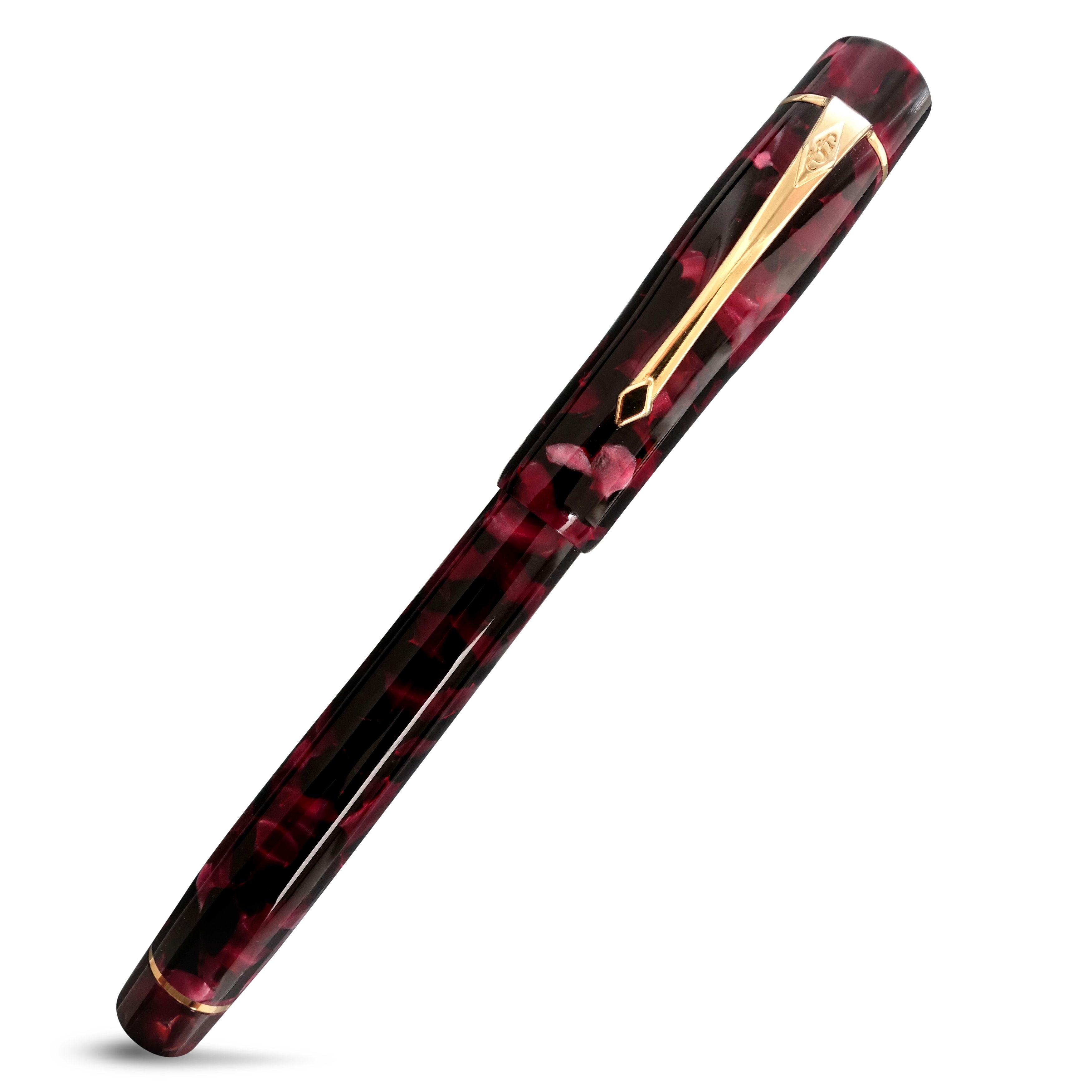 El Conway Stewart Wellington Classic Claret es un bolígrafo bellamente diseñado con una forma sutil y curvilínea, que brinda comodidad durante el uso prolongado. Elaborado con el exquisito acrílico Classic Claret, este bolígrafo irradia un atractivo clásico y contemporáneo. El fondo burdeos, que recuerda al granate fino, con formas negras y nacaradas crea un acabado general sutil y elegante. Cada bolígrafo es único debido a la complejidad de la mezcla de colores. Esta pluma exclusiva está disponible como pluma estilográfica con puntas finas, medianas o anchas Flag de oro de 18 quilates y viene en una caja de presentación de cuero negro Conway Stewart, que también sirve como soporte de exhibición para su escritorio. Solo 5 de estos bolígrafos están disponibles, lo que los convierte en un artículo altamente coleccionable.
