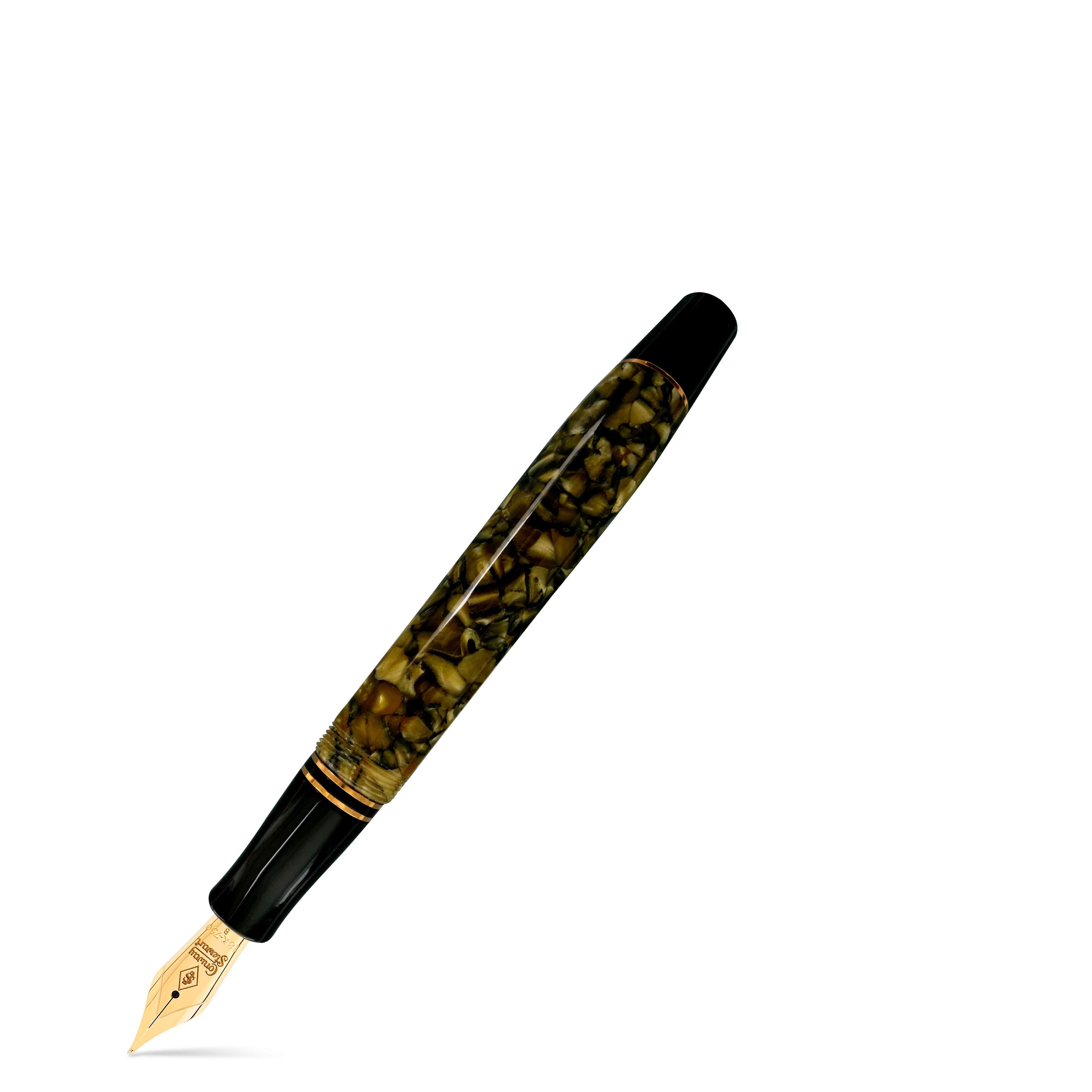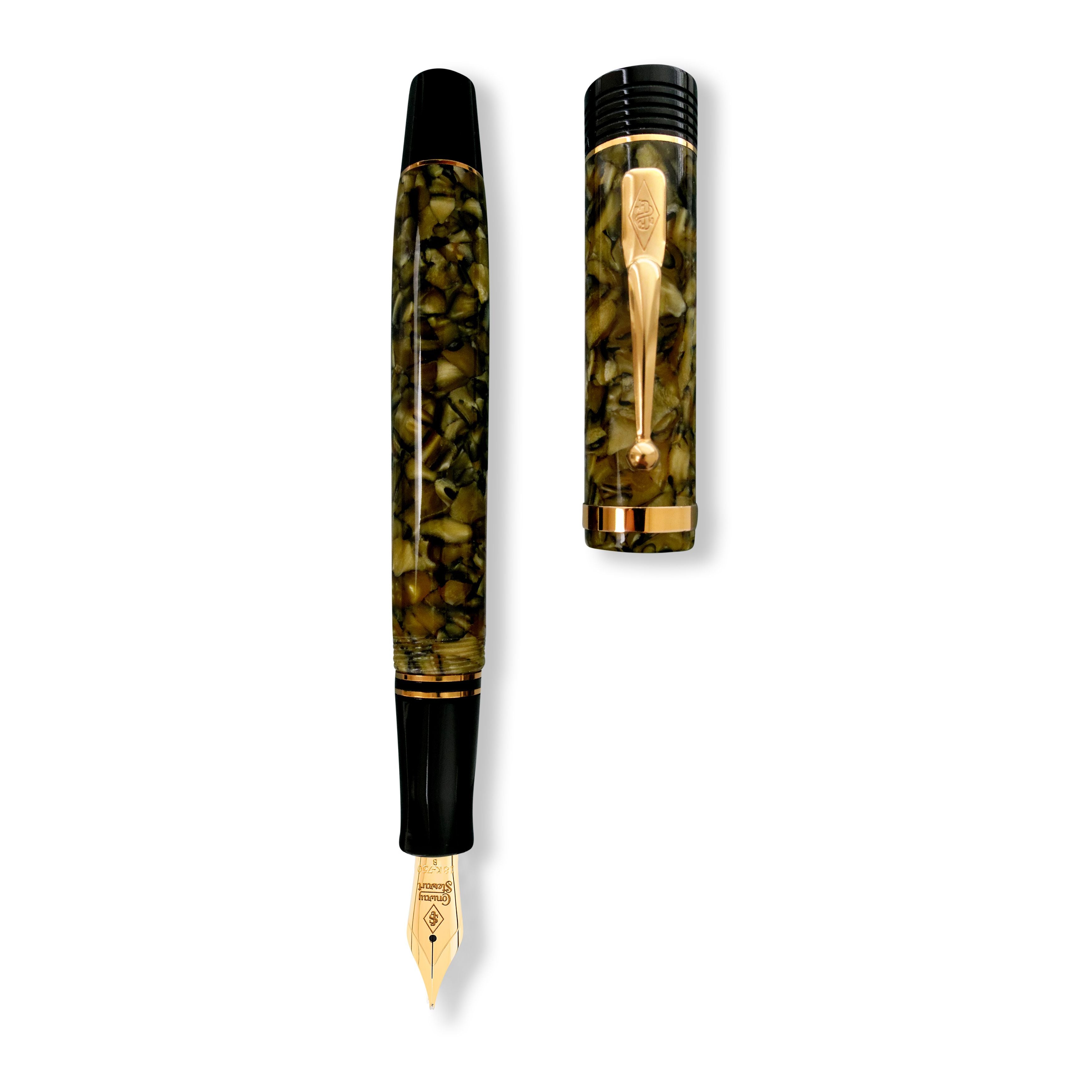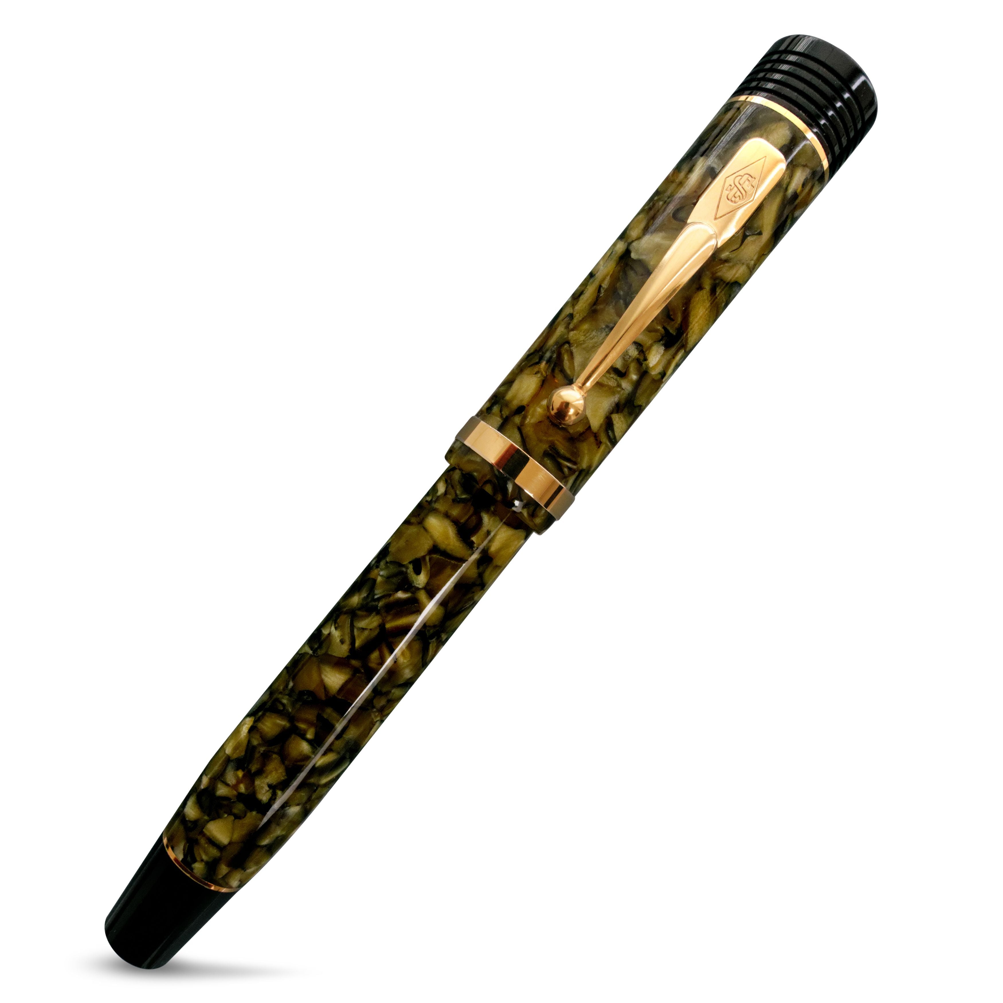 El Conway Stewart Churchill Quartz Green es un bolígrafo impresionante que cuenta con una hermosa combinación de motas verdes, marrones y negras. Con sus tonos más claros y oscuros y sus lujosos accesorios dorados, esta pluma seguramente llamará la atención de muchos admiradores. El anillo de capuchón de oro de 9 quilates está estampado con sellos ingleses, un testimonio de su calidad y herencia. Disponible como pluma estilográfica, bolígrafo, rollerball o lápiz, el Conway Stewart Churchill Quartz Green es imprescindible para aquellos que aprecian la artesanía fina y el diseño excepcional. Ya sea que sea un coleccionista o un usuario diario, este bolígrafo seguramente lo impresionará.
