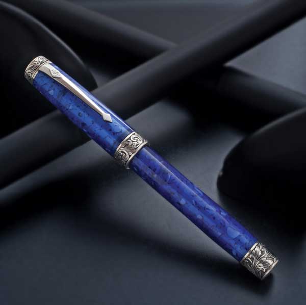 El Windsor está creado en plata de ley maciza contrastada. Luego se aplica manualmente un revestimiento de resina translúcida sobre la tapa, el cilindro y la sección de agarre. Esto da un brillo que sólo se puede lograr permitiendo que la plata que hay debajo brille.