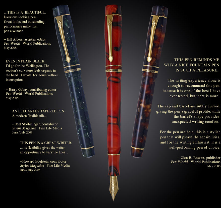 El Wellington es un bolígrafo sustancial, disponible en cuatro modos de escritura: elegante pluma estilográfica, bolígrafo de escritura suave, práctico bolígrafo y lápiz. El nuevo y sorprendente diseño ha sido elaborado con una forma sutilmente curvilínea tanto en la tapa como en el cuerpo, una nueva y emocionante forma que distingue al Wellington de los diseños de bolígrafos tradicionales. El Wellington fue creado teniendo en cuenta el estilo continental para lograr una apariencia elegante y clásica. Esto se combina con nuestro uso tradicional de rica resina veteada y adornos de oro pulido para dar como resultado un bolígrafo que se adapta tanto a la alta costura como al refinamiento de buen gusto.