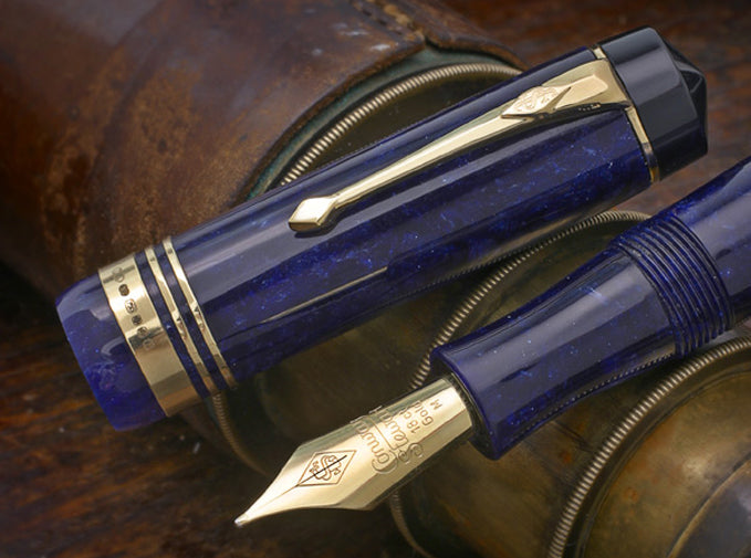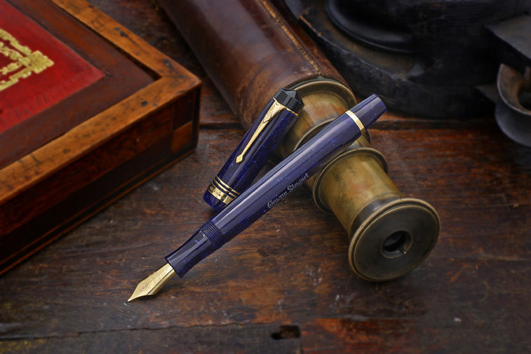 Fabriqué à partir de notre acrylique Blue Stardust sur mesure, le Trafalgar est magnifique. Il contient de fines particules de poussière d'argent qui scintillent subtilement lorsque la lumière atteint le stylo.