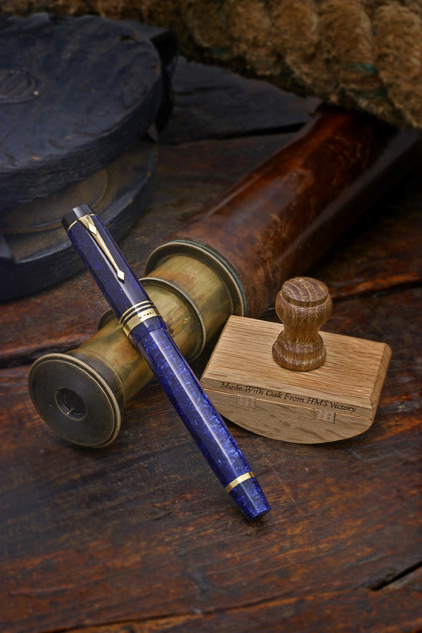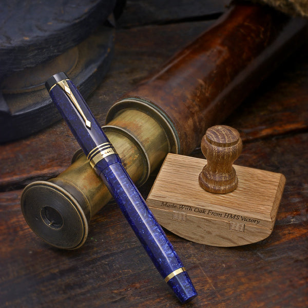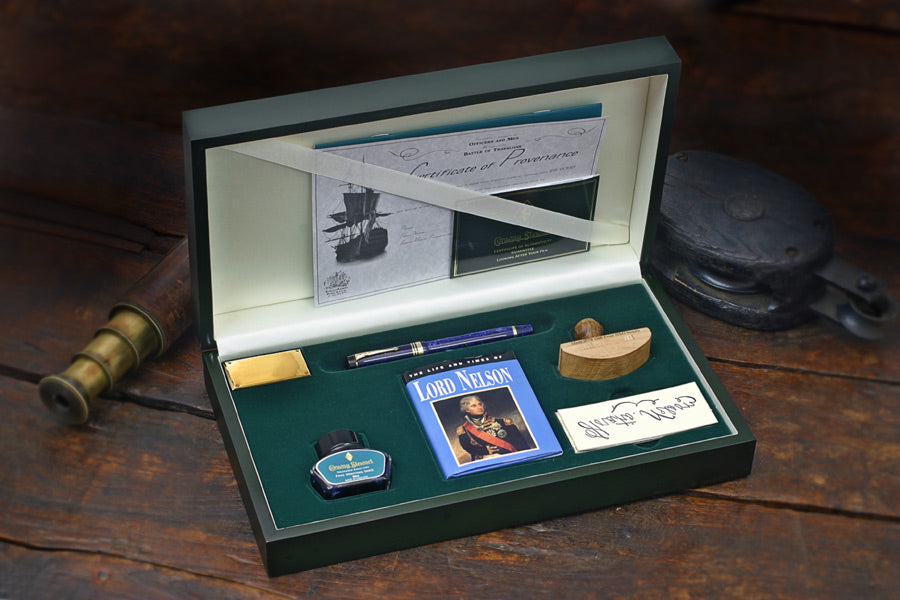 Il est accompagné d'un livre informatif détaillant la vie de Nelson, d'une bouteille d'encre Conway Stewart et d'un buvard à bascule fabriqué à partir du chêne réel retiré de l'historique HMS Victory.