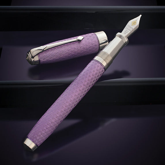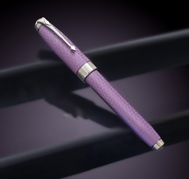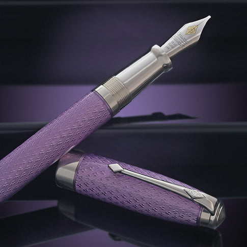 Lovingly constructed of hallmarked solid sterling silver, the Elizabeth Garrett Anderson pen has been designed in the style of Fabergé, with a highly detailed guilloche fox-head pattern engraved on the cap and body. It is skilfully covered with vibrant bonded enamel in a delicate shade of lavender. This exquisite pen shows all the characteristics necessary for becoming a modern design classic.