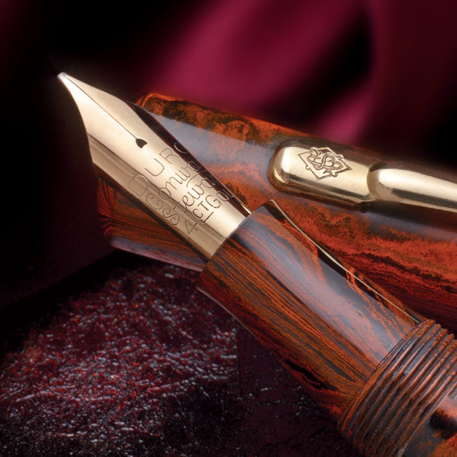 コンウェイ・スチュワート マールボロ ヴィンテージ リミテッド エディションは、ヴィンテージ モデルのクラシックなスタイルにインスピレーションを受け、現在の製造技術で作成された傑出した新しいデザインで、コンウェイ スチュワート ファミリーに時代を超越した新たな製品が加わりました。 マールボロはウィンストン・チャーチル卿の姓にちなんで名付けられ、誇り高い英国の伝統と結びついた視覚的に印象的な筆記具として、当社の主力モデルであるチャーチルの伝統を継承しています。 キャップとバレルの形状が直線的なデザインで、ビンテージ スタイルのワッシャー クリップを備えたマールボロは、1920 年代の最高級のコンウェイ スチュワート ペンを思い出させます。 ブリテンズ ベストの初期の例に忠実に、現在のマールボロ ヴィンテージ モデルは、1930 年代初頭まで万年筆メーカーに選ばれていた素材である本物のエボナイトを限定して使用しています。 キャップトップの彫刻のアクセント、18カラットの純金またはスターリングシルバーで作られた幅広のバレルバンド、そして伝統的なレバーフィルシステム、スポイトフィル、またはカートリッジコンバーターの選択を備えたマールボロヴィンテージは、まるで本物の世界から抜け出したかのように見えます。 1920年代。 マールボロ ヴィンテージに選ばれた素材は最高品質のエボナイトで、ブラック、ブルー リップル、ローズ リップル、木目調仕上げからお選びいただけます。それぞれの作品は、色、パターン、一貫性が注意深く検査されます。デボンの職人によって個人的に選ばれたエボナイト素材はペンの部品に加工され、手作業で組み立てられ、手作業で研磨され、慎重に手作業で取り付けられ、すべてのマールボロ ヴィンテージ万年筆が最高の品質基準に保たれるようにしています。 バレルには幅広のしっかりした貴金属バンドがアクセントになっており、バンドのないキャップの上部には、コンウェイ・スチュワートのごく初期のペンのデザインを彷彿とさせる彫刻デザインが施されています。 レバー充填バージョンには新しく改良された内部機構を採用し、インク嚢をより簡単かつ完全に充填できるようにしました。レバー自体はマールボロのトリムに合わせて豪華にメッキされ、CS ロゴが飾られています。...
