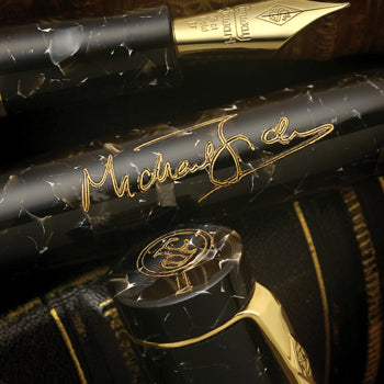 笔杆底部饰有 18 克拉纯金环,截面处饰有大金带,笔杆上刻有迈克尔·杰克 (Michael Jeck) 的亲笔签名。帽子上有一对纯金带子,帽子顶部刻有“Detection Collection”标志。该钢笔配有 18 克拉纯金笔尖,有八种笔尖等级可供选择,从超细到超宽、细斜体、中斜体和宽斜体。墨水通过扭转填充机制输送,允许使用我们瓶装墨水提供的多种颜色选择。
