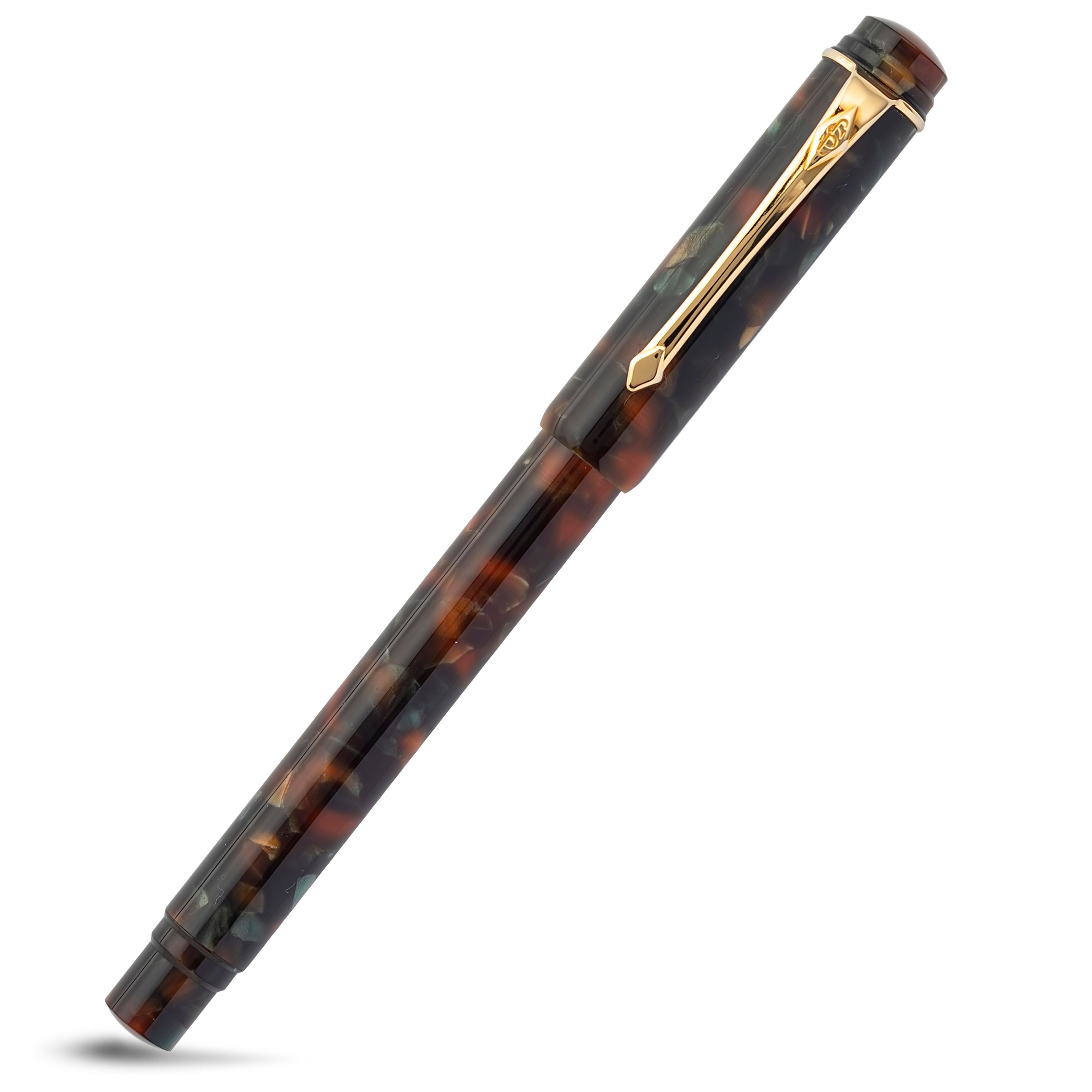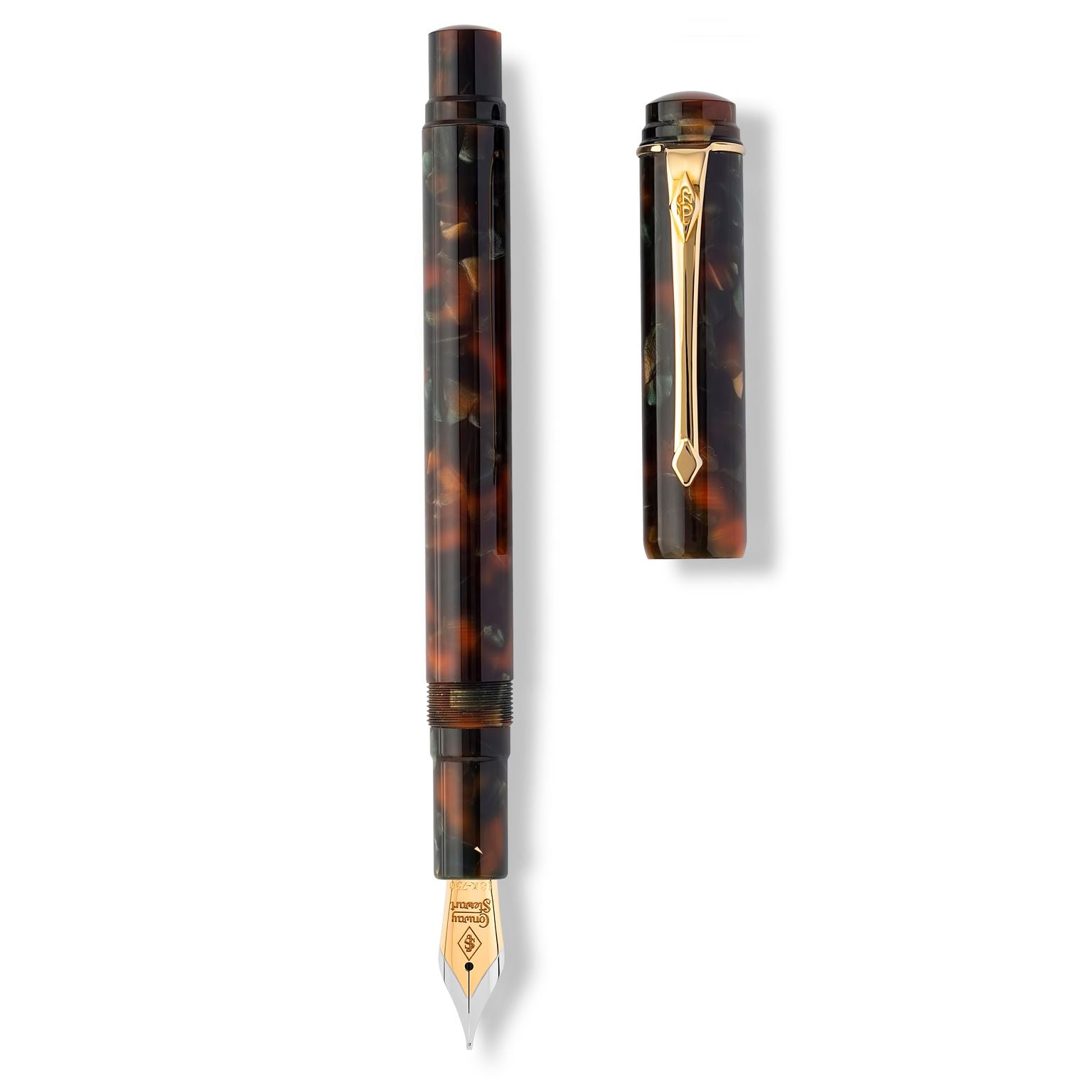 Conway Stewart Capulet Bracken 是一款中等大小的轻型钢笔,非常适合日常使用。作为该品牌的入门型号于 2013 年推出,它迅速成为钢笔世界新手的负担得起的选择。 Capulet 可选择真正的 Conway Stewart SS 笔尖或 18ct 金旗帜笔尖,用途广泛且功能齐全。黑色皮革展示盒兼作桌面展示,​​使其成为任何工作空间的优雅点缀。对于收藏家和鉴赏家来说,Capulet 系列提供了最后的机会,将这款心爱的笔添加到他们的收藏中。